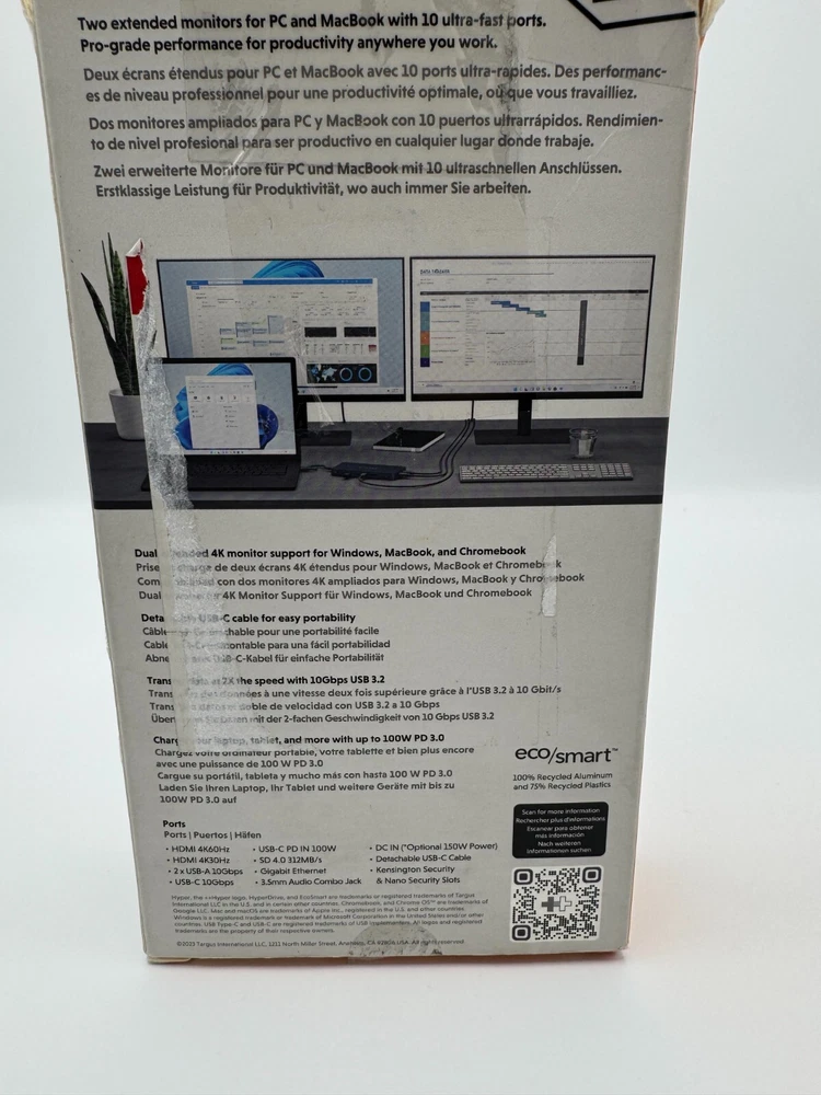 Transform your workspace with the Hyper Work from Anywhere Dual Monitors and 10-Port Business-Class USB-C Dock, designed for professionals who need to work efficiently from anywhere. This open-box item is in excellent condition and offers an all-in-one solution for productivity, with seamless connectivity, versatile ports, and a compact, portable design. Whether you're working from home, on the go, or setting up a remote office, this setup has everything you need to maximize efficiency and multitask effortlessly. Key Features: Dual Monitor Setup: Two high-resolution monitors, perfect for multitasking, video conferencing, and productivity-focused work environments. 10-Port USB-C Dock: Includes a powerful 10-port business-class USB-C dock that expands your device's connectivity options, offering extra USB ports, Ethernet, and video output options. Universal Compatibility: Supports a wide range of devices including laptops, tablets, and smartphones via USB-C, making it ideal for both Mac and Windows users. High-Speed Connectivity: Fast data transfer rates and multiple high-speed USB ports for peripherals, as well as HDMI/DisplayPort for additional displays. Portable & Compact: Easy to carry and set up anywhere, perfect for remote work, business trips, or small office spaces. Plug and Play: No additional software needed. Simply plug in your device and you’re ready to go. Open Box Condition: Lightly used, fully tested, and in excellent working condition. Box shows wear and tear.