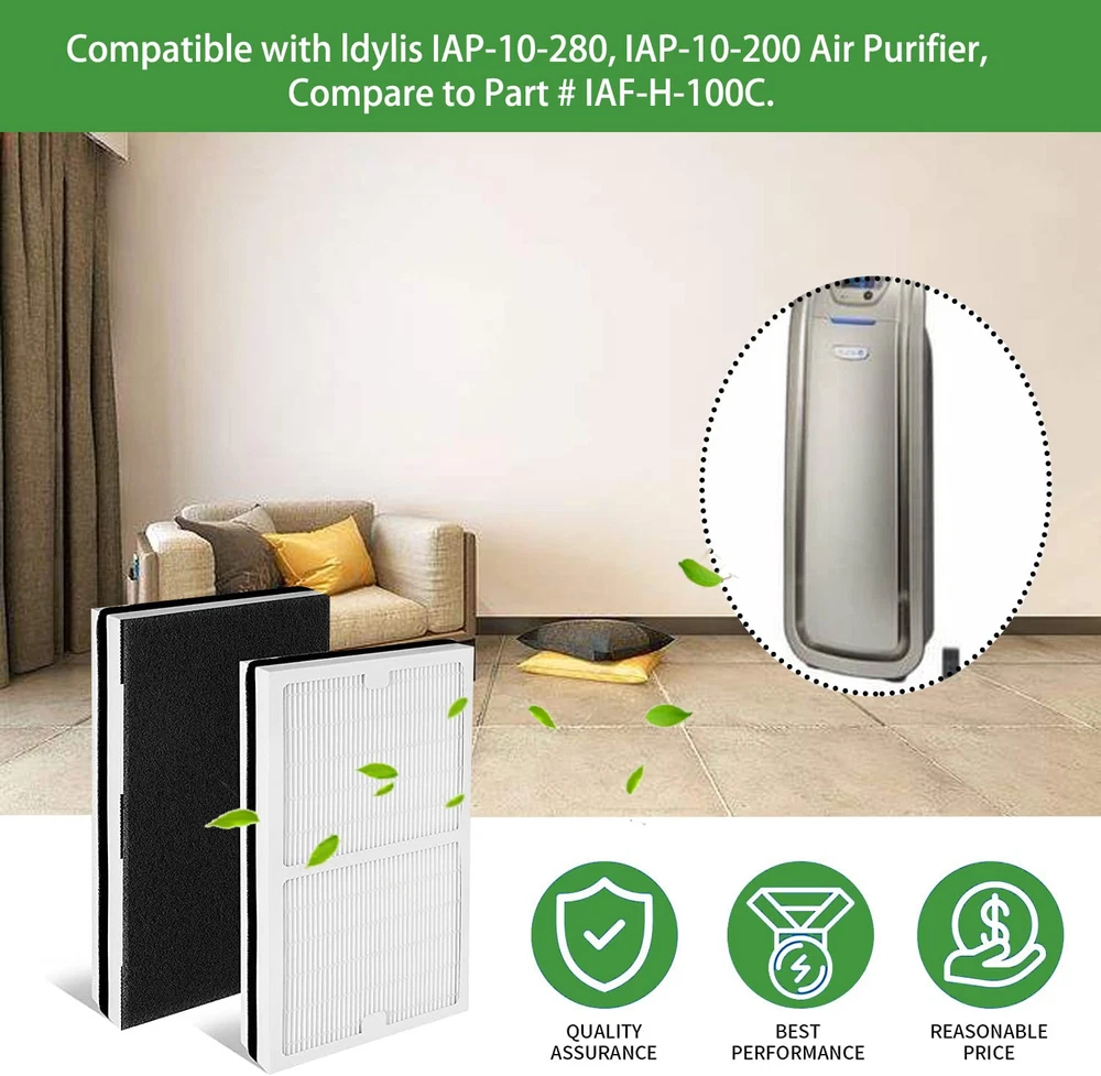 with: TReplacement idylis Filters C fit for: idylis IAP-10-200 & IAP-10-280, Model # IAFH100C, IAF-H-100C & 302656 IAF-H-100C-P, IAP10200, IAP10280. IAFH100C is also known as 302654, 302656, 302655, LOWESRAPF-C-4. Package: 2 * HEPA Filters +4 * Carbon Filters for Idylis IAF-H-100C , with free brush Installation and use method:Just remove your old Idylis filter and put the filter back in place!The filter is washable and reusable ensuring long life. Replace filters every 6 to 12 months for optimal performance or three (3) to four (4) times per year depending upon usage. Texture:High quality, special design,cheap price, make it to replace easier when you need to change the filter element.