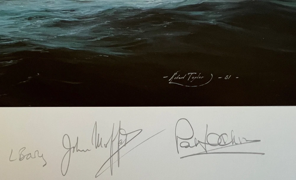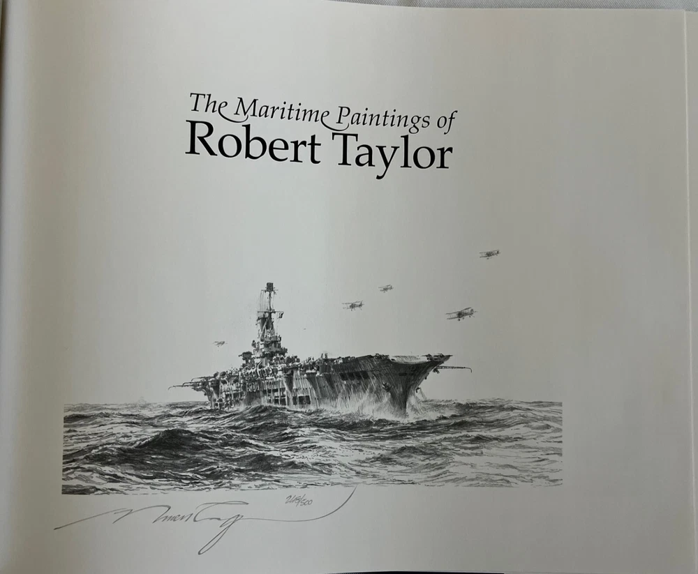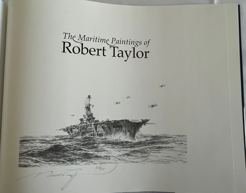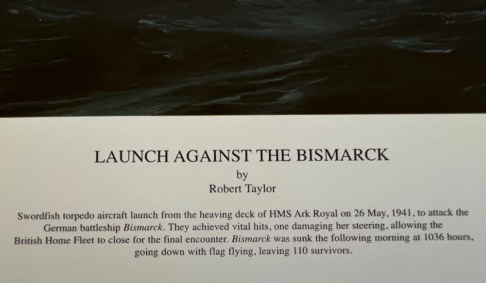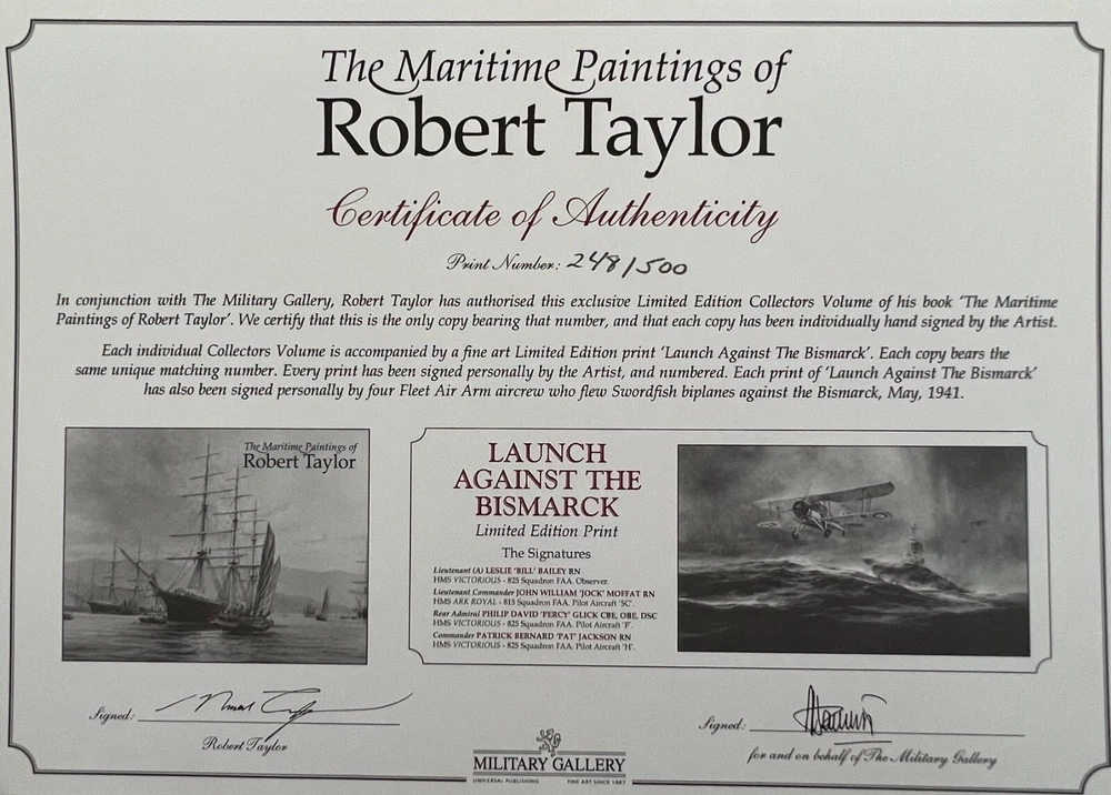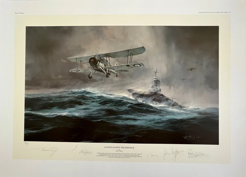 Launch Against the Bismarck Robert Taylor Limited Edition Signed and Numbered Print and Maritime Paintings Book Only 500 Limited Edition prints and books Lithograph print and book signed by Aviation Artist Robert Taylor For sale is a Limited Edition print by renowned aviation artist, Robert Taylor. The print comes with a certificate of authenticity from The Military Gallery. It also comes with a Maritime Paintings Book with matching number. The print is in excellent condition, never framed and is stored flat in a nonsmoking environment. The overall size of the print is 26.5" x 19". The book is in excellent condition stored in a protective sleeve. The book will be shipped separately from the print. Print/Book #: 248/500 ***Also available Print/Book #: 249/500 The print is signed by Robert Taylor and four Fleet Air Arm aircrew who flew Swordfish biplanes against the Bismarck, Ma, 1941: Lieutenant Leslie ‘Bill’ Bailey Lieutenant Commander (A) John William ‘Jock’ Moffat Rear Admiral Philip David ‘Percy’ Glick Commander Patrick Bernard ‘Pat’ Jackson The print depicts Swordfish biplanes being launched from the HMS Ark Royal in May 1941. The Swordfish are assigned to locate the German battleship Bismarck. The mission is successful in hitting the battleship and jamming its rudder. This action allowed ships of the British fleet to locate and sink the partially disabled Bismarck.