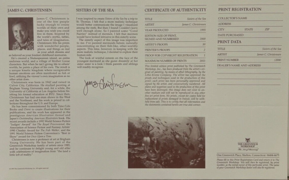JAMES CHRISTENSEN " Sisters of The Sea " Anniversary Limited Edition Print 21.5" x 30" Overall Size 18" x 27"- image size 2k numbered prints MINT CONDITION - BRAND NEW This piece has never been framed so it has all of it's colors ! It is in perfect mint condition and never framed. It has its certificate of authenticity, write up on the artist and the piece and comes in its mint, print folder. We are authorized dealers with almost every publisher in N. America and know we can list world class artists at remarkable prices !! We offer FREE pick up of winning items at our Art gallery located in Canada's beautiful Rocky Mountains. Shipping is done in some of the best built, strong boxes ever seen - always completely insured . Any problems and we ship a new piece immediately - no cost to you!! We will send an email within 24 hours of the auction ending. Canadian residents add GST. We accept paypal and anyone can call the gallery toll-free with a visa or mastercard. We try to ship the same day, but some items may ship the following week. Shipping Information All items are completely insured to arrive in MINT condition! We ship in some of the strongest boxes in the industry! We combine shipping everyday, on most all pieces. Art Country Canada Rocky Mountain Art Gallery 729 Main Street Canmore , Alberta T1W 2B2 Mill Pond Press Dealer / Somerset Publishing Dealer / Wild Wings Dealer and many more TERMS OF SERVICE EBAY is one side of our business, having a fine art gallery we are able to custom frame most items in our gallery. We work hard to do business the old fashioned way, we treat all customers as if they are family. We answer emails courteously and are fair in all our dealings. We have a toll free number for easy service. Please feel free to contact us at anytime, with any question or comment. We make every effort to answer all emails as quickly as possible. WORLDWIDE SHIPPING We sell and ship worldwide, so please email us for a quote to any location, we dropship to any address if it is a gift. We charge shipping based on the Canadian Postal System and all items are sent fully insured. METHODS OF PAYMENT We accept Paypal which accepts the major credit cards, or we also take Credit Cards Directly over the phone, (MC, VIS A,). We accept whatever method is most convenient for you. We ask all auctions to be paid for in the fastest possible time frame. LOCAL PICK UP We encourage customers to pick up items at our gallery.