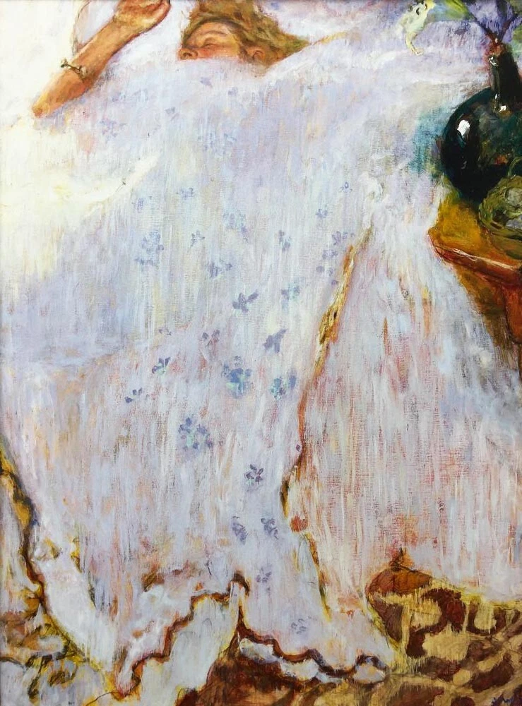 Jamie Wyeth "Overslept" This Artprint is: NEW CUSTOM FRAMED In two toned brown/gold wood frame Double Matted in yellow and white Framed Size : 17" x 14" Image Size: 10" x 7.5" Framed in the USA Hanging hardware included on back of frame Interested in different framing? Contact us!! THE FRAMING ALONE IS WORTH OVER $125! James Browning Wyeth b. July 6, 1946 Jamie Wyeth has since adolescence attracted considerable attention as a third-generation American artist: son of Andrew Wyeth, among the country's most popular painters, and the grandson of Newell Convers Wyeth, famous for his distinctive illustrations for the classic novels by Stevenson, Cooper, and Scott. "Everybody in my family paints - excluding possibly the dogs," says Jamie Wyeth. And non-human subjects are a common theme: long a sensitive observer of his rural surroundings, he paints livestock and other animals with the same care and intensity he devotes to portraits of people. He won precocious fame, in fact, with Portrait of Pig , his picture of a pink and white sow. The technical facility Wyeth showed even in his early work helps explain why his first one-man show in New York happened when he was only 20, and a retrospective in Omaha, Nebraska, occurred before his 30th birthday.