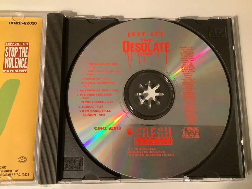 Hard to find original gangster of hip hop Just-Ice 3rd album The Desolate One CD original Fresh records pressing from 1989 featuring production by KRS One, D Nice and DJ Doc. CD, inserts and jewel case are like new, no promo marks. No extra shipping charge for additional purchases