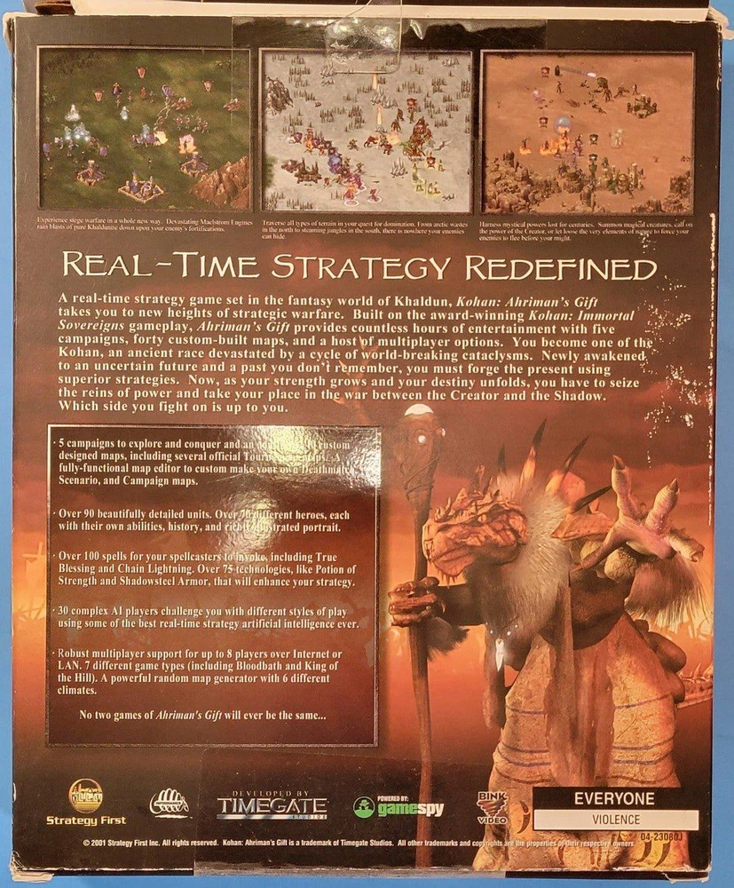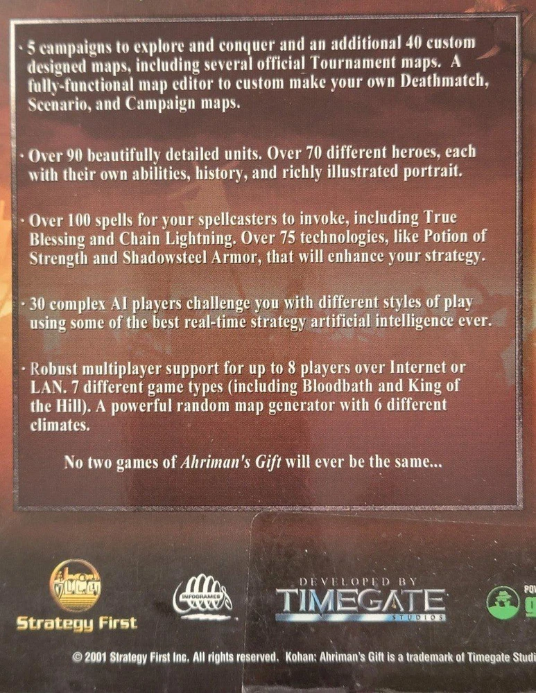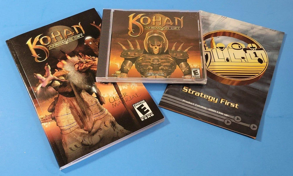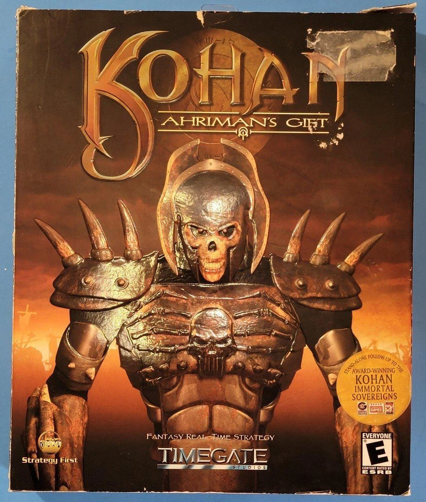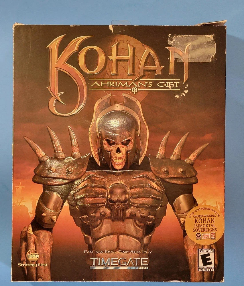 Kohan Ahriman's Gift Vintage Big Box PC RTS Real Time Strategy Game. 2001, Timegate, Strategy First. Kohan: Ahriman's Gift, awarded “Strategy Game of the Year” by Computer Gaming World, is a real-time strategy game set in the fantasy world of Khaldun. Built on the award-winning Kohan:Immortal Sovereigns gameplay, Ahriman's Gift is the stand-alone prequel to Kohan: Immortal Sovereigns. Tags: Vintage electronics computers software programs games adventure rpg role playing fantasy Science fiction Scifi turn based real time strategy rts scarce collectible collector Collection collecting kohan ahrimans gift