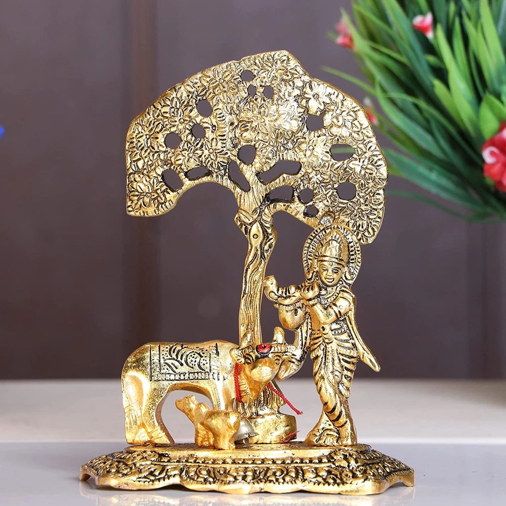 DESCRIPTIONS - Package Contains - 1 Cow krishna statue, Material -Aluminium, Color - Gold Oxidized, Size H x W x L- 17 Cm x 12 Cm x 8 Cm Handmade Handicraft Gift Piece Gives Royal and Rich Look Wherever It Is Placed Considered a must have element in Vastu. Kamadhenu Cow is considered a wish granting symbol. Place anywhere in house or workplace for Health, Wealth and Prosperity