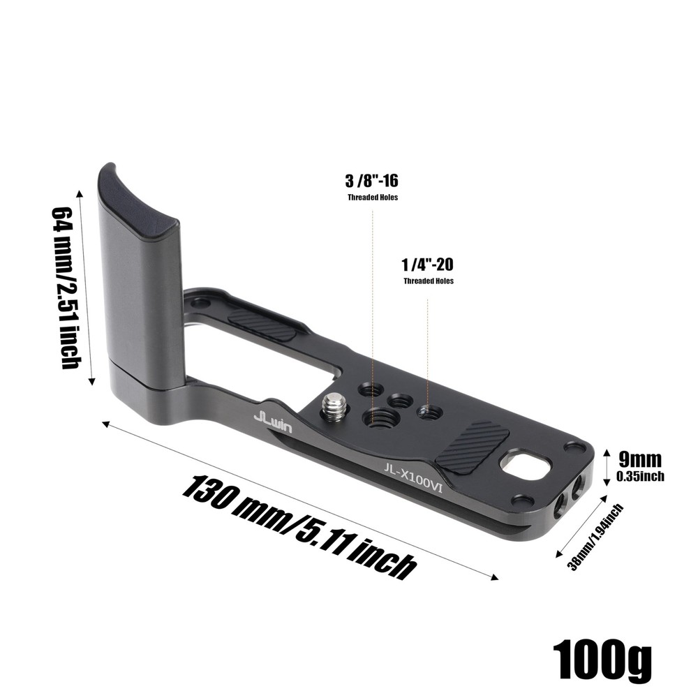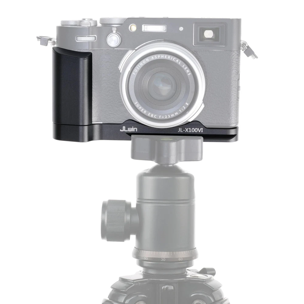 Quick Release Plate with L-Shape Side Handle Grip for FUJIFILM X100VI Camera (Black) 【Delicate Structure】This L-Shaped bracket holder with side handgrip is custom designed for FUJIFILM X100VI digital camera, perfect match for the camera body, and allows full access for battery compartment and flip screen. It helps you to reduce arm fatigue and provides easy mounts when handheld shooting and video vlogging. 【Baseplate for Arca-Swiss standard】The quick release baseplate is compatible with Arca-Swiss standard tripods, and can be easily disassembled and assembled to fit different shooting experience. 【Standard 1/4"-20 screw】Connet the camera with included 1/4"-20 screw. The baseplate has extra 1/4"-20 & 3/8"-16 threaded mounting holes for attaching camera to tripod or stabilizer. 【Anti-Twist Design】The bottom of the plate has anti-slip pads and anti-deflection design to protect the camera from scratching and movement. 【Premium Quality】Made of aluminum alloy with ergonomic design, provides a comfortable and lightweight handheld shooting.