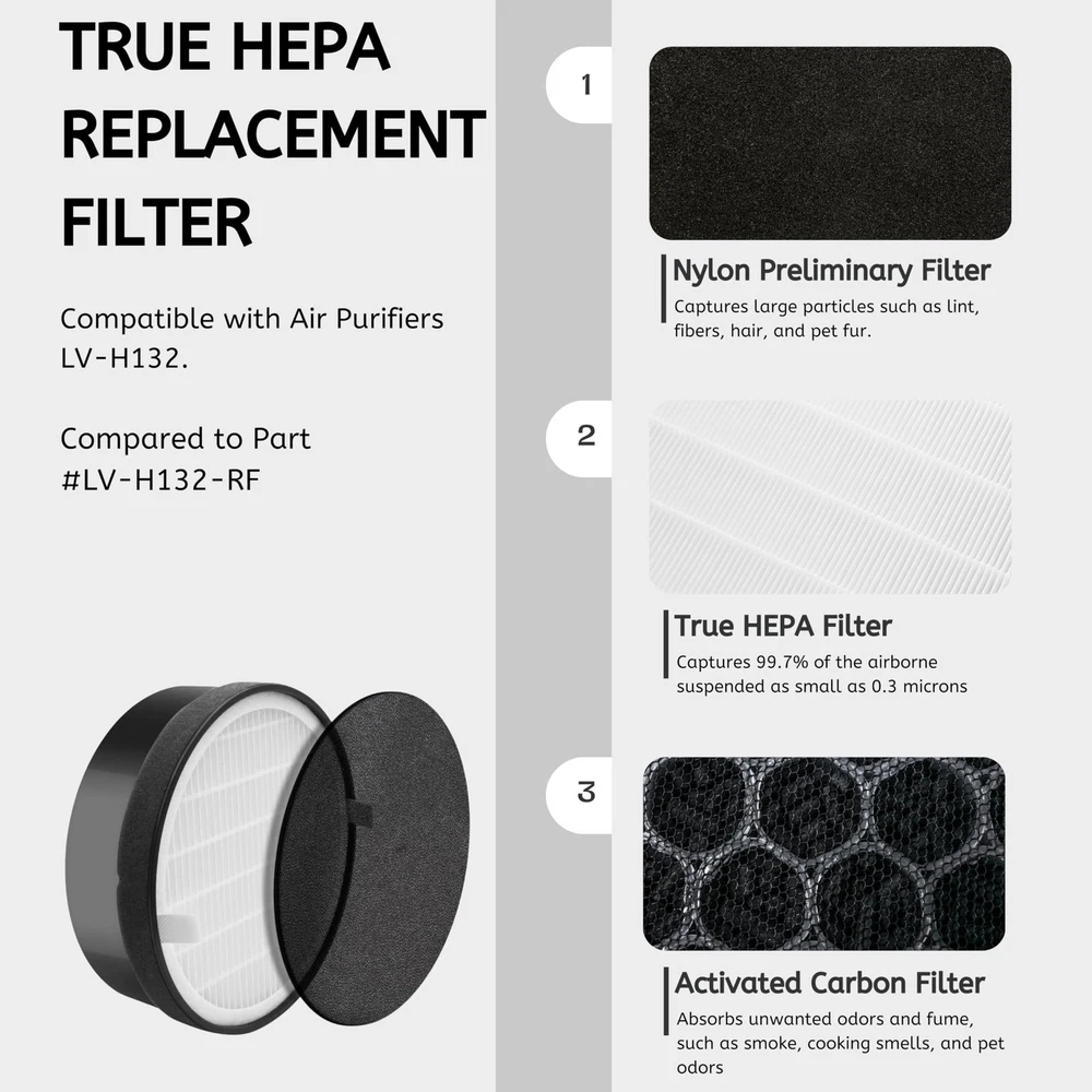 Premium aftermarket filter replacement set compatible with Levoit Air Purifier LV-H132. A set of 4 filters included. HEPA FILTER: HEPA filters capture up to 99.97 percent of airborne particles size as small as 0.3 microns. The activated carbon pre filter eliminates many common household odors and chemical VOCs. Dimension: 7.5 x 2.4 x 7.5 ". Suggest to replace every 6 months Quality meets or exceeds leading national brand