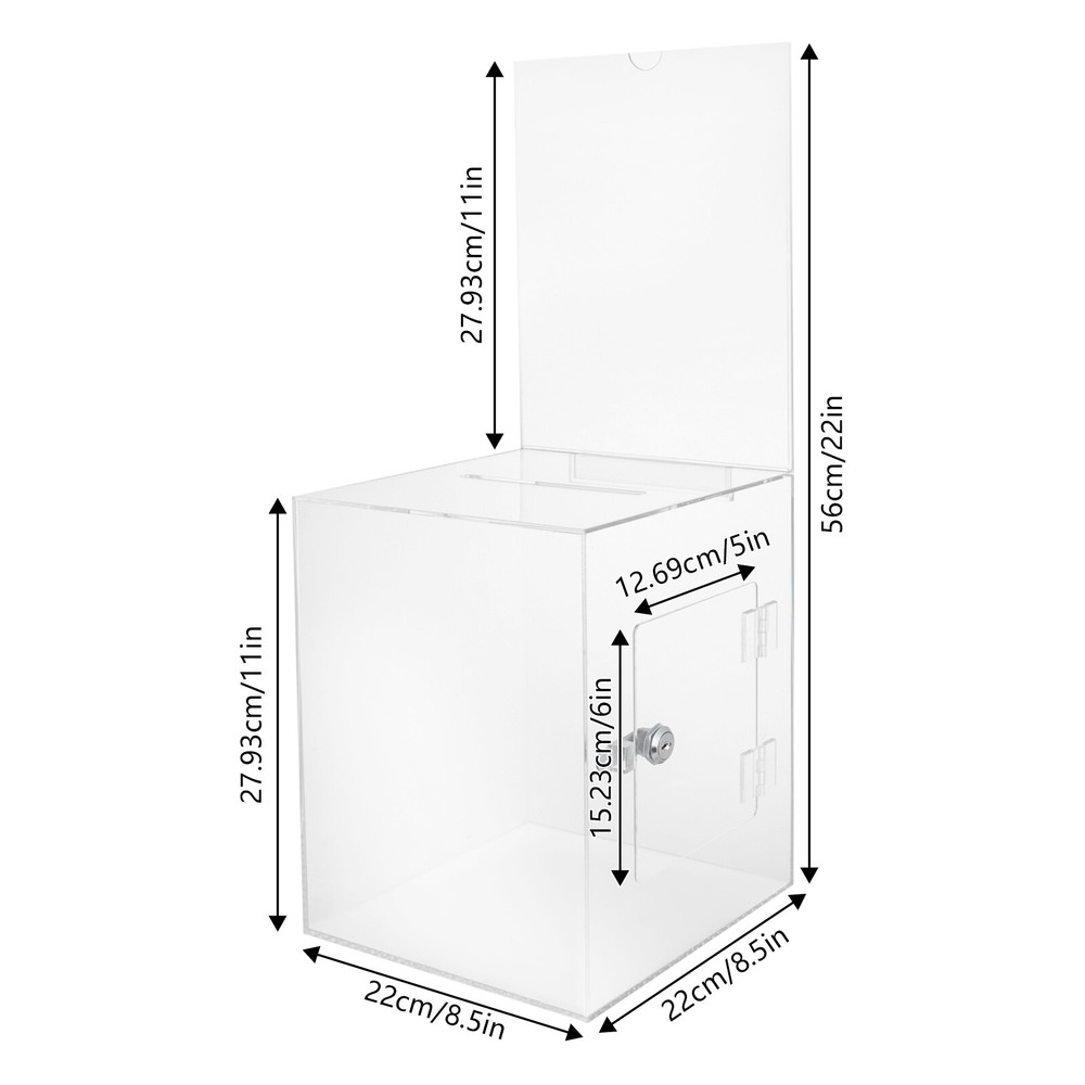 Specification Material: PP Color: Blue Display Type: LED Assembly Required: Yes Mounting Type: Tabletop Plug Type: US Standard Power: 80W Voltage: 110V, DC 12V Power Source: Corded Electric/12V Battery Frequency: 50-60Hz Temperature: 0-99℃/32-210.2℉ Humidity: 50-80 Egg Hatching Capacity: 128 Eggs Product Size: 48.7*48.7*38cm/19.17*19.17*14.96in Package Size: 54*54*40.5cm/21.26*21.26*15.94in Gross Weight: 9kg/19.84lbs Net Weight: 8.5kg/18.74lbs Package Included 1* Egg Incubator 1* Power Cable 1* English Manual 1* 12V Battery Connection Cable Other Accessories for Assembly Large Acrylic Suggestion Box, Ballot Donation Box, Acrylic Donation Voting Box Welcom to yybshop06 Description Voting or fundraising activities are right in front of you, but do you lack practical voting boxes? Let's take a look at our clear acrylic ballot box! With a lock and two keys, it can help you organize more professional voting and fundraising activities while ensuring the openness and fairness of the activities. Key Features High-quality and Durable: It is made of high-quality acrylic with assembling and bonding processes, which has high tenacity and is not easy to break and deform. Suitable Size: The box size of 8.5*8.5*11 inches provides sufficient space to accommodate items like coins and coupons while only taking a small footprint, making it a very suitable size. Visible Design: The high-transparency acrylic provides excellent visibility to the items inside, you can use it as a ballot box to ensure justice or as a charity box to showcase the love from people. Good Protection: It has a lock with 2 keys that can prevent the loss of internal items and also provide convenience for you to take out internal items. Good Helper: With the help of this ballot box, you can easily accept the opinions of employees or customers and solve existing problems promptly, which is conducive to improving your image and providing better services for them. Easy to Clean: The smooth surface and simple structure allow you to easily remove dust from the surface with a towel. Ideal Gift: This practical product will be a wonderful surprise for your friends who need voting and fundraising activities, making their activities more professional. Buy with Confidence: We stand behind all our guests and look forward to assisting you with your purchase. It is our pleasure to answer your confusion and questions. The end of the story between us is not "we sell and you buy". Details Sign Holde r : You can insert paper with voting or donation promote information into it without the need for glue. The curved groove design makes it more convenient for you to take out the paper from the sign holder. Slot : It is convenient for you to put in letters or cards. Application It is suitable for restaurants, companies, churches, coffee shops, hotels, salons, bars, proms, parties, marketing promotions, tradeshows, exhibitions, etc., to accommodate donations, ticket comments, suggestions, coupons, ballots, notes, coins, business cards, and tips. Specification Color: Clear Style: Modern Shape: Rectangular Material: Acrylic Process: Assembling, Bonding Assembly Required: No Mounting Type: Tabletop Lock Type: Key Number of Keys: 2 Capacity: 0.0075m³/0.26ft³ Suspended Load Capacity: 2kg/4.4 lbs Thickness: 3mm/ 0.12in Product Overall Height: 56cm/ 22in Package Size: 25*33*30cm/9.84*12.99*11.81in Box Size: 21.6*21.6*28cm/8.5*8.5*11in Box Door Size: 12.7*15.24cm/ 5*6in Sign Holder Size(L*H): 22*28cm/8.5*11in Slot Size: 100*5mm/ 3.93in*0.2in Gross Weight: 2.8kg/ 6.17lbs Net Weight: 2.3kg/ 5.07lbs Package Included 1* Ballot Box 2* Keys Notes Please confirm the dimensions before purchasing. Please note this product does not include any card or money. Please allow the slight color difference caused by the shooting light and 1-3 cm error due to manual measurement, and make sure you do not mind before ordering. Payment Delivery details Terms of sales About us Contact us Payment We accept ebay payment 。 Fees such as import duties, taxes are not included in the item price or shipping costs. These charges are the buyer's responsibility. Delivery details Shipping: 2-9 working days to: USA Terms of sales We maintain high standards of excellence and strive for hundred percent customer satisfaction. Feedback is very important to us. We hope that you contact us immediately before you give neutral or negative feedback, so that we can address your concerns. It is impossible to address issues if we do not know about them! About us Your satis faction is our ultimate goal. We work hard to earn your trust and future business. Our certified technicians have tested each item before shipping. The unit comes with 1 year limited warranty on all manufacturing defects. a) If you receive a defective item, you may return it or ask for a discount. Please contact us within 14 days after you receive the package. b) What you returned must be intact and in its original packaging as re? u. Customer is responsible for shipping costs of the returned item. c) We will cover the cost of shipping back t with the shipping rate indicated in the registration page. We will send you a new unit or refund the full payment you paid. Thank you. Contact us Business Hour Business Hour: Monday To Friday: 8:30 AM to 5:00 PM (Beijing China time) Due to time zones, our reply to your questions may not be immediately. But within above working time, we will reply your email within 24 hours. If it's non-workdays, please kindly be patient and wait till Monday. Please contact us with ebay message. Please feel free to contact us if you have any questions. Monday To Friday: 8:30 AM to 5:00 PM (Beijing China time) Due to time zones, our reply to your questions may not be immediately. But within above working time, we will reply your email within 24 hours. If it's non-workdays, please kindly be patient and wait till Monday. Please contact us with ebay message. Please feel free to contact us if you have any questions. Featur