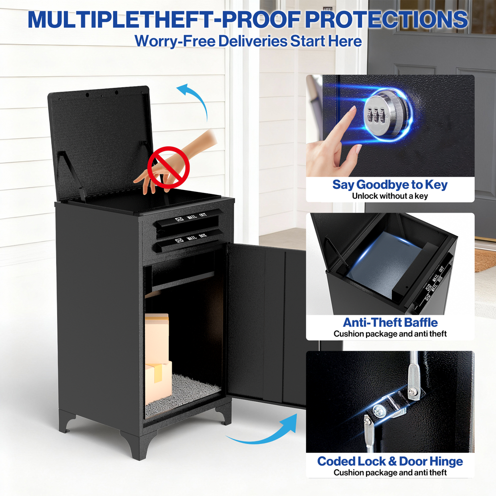 POCHAR Large Package Delivery Boxes for Outside, Heavy-Duty Steel Parcel Drop Boxes with Anti-Theft Design for Home, Large Waterproof Package Lock Box with Coded Lock for Outdoor, Porch, Curbside 【Extra Large Capacity】POCHAR extra large mailbox offers oversized space for multiple large packages, plus all your other curbside mailbox deliveries. Dimensions: L21.26 x W18.43 x H39.37 inches. Suitable for various package sizes. Features separate compartments for letters and packages, enabling organized storage. This parcel box comes with pre-drilled holes, a sturdy combination lock, and a complete set of mounting hardware for easy assembly. 【Durable, Weatherproof Design】parcel box boasts a galvanized steel structure with effective waterproof and rust-resistant properties for lasting durability, keeping packages safe and dry. Four raised feet on the bottom keep the box elevated above standing water, while the cabinet anchors securely to the ground. The sloped roof design facilitates natural runoff of rainwater and snow, eliminating water accumulation risks. Comprehensive Package Protection. 【Multi-Layer Anti-Theft Security】The POCHAR outdoor delivery box features a secure combination lock and internal hinges for package safety. The delivery slot includes a large anti-theft baffle, reinforced screws, and hydraulic support rods to prevent theft and absorb impact. Full-process protection for your packages. 【24/7 Secure Package Delivery】Couriers can safely deliver parcels around the clock without requiring you to wait at home. The keypad lock eliminates worries about lost keys, hiding spots, or complicated operations—ideal for remote workers, frequent travelers, and anyone seeking a convenient delivery experience. 【Multi-scenario & Customizable】Offers customizable address stickers to guide delivery personnel to outdoor locked mailboxes. Perfect for homes, apartments, porch, yardor, curbside, and businesses, providing a reliable solution for all your delivery needs. Pochar's customer service team provides 24-hour service. This is a Brand New product If you would like an Open Box discount, please visit our store front to see more listings. Contact us through Ebay for any questions Our dedicated Customer Service is here to help Monday to Friday (9am to 5pm PST) All POCHAR products are sold with a one (1) year manufacturer warranty including replacement parts. Check our Store Front for more product listings! POCHAR Sales | Store Front Thanks for shopping POCHAR! The actual color of the product may be different from the image you see. This is due to the fact that every computer monitor, laptop, tablet and phone screen has a different capability to display colors and that everyone sees these colors differently. We try to edit our photos to show all of our products as life-like as possible, but please understand the actual color may vary slightly from your monitor.