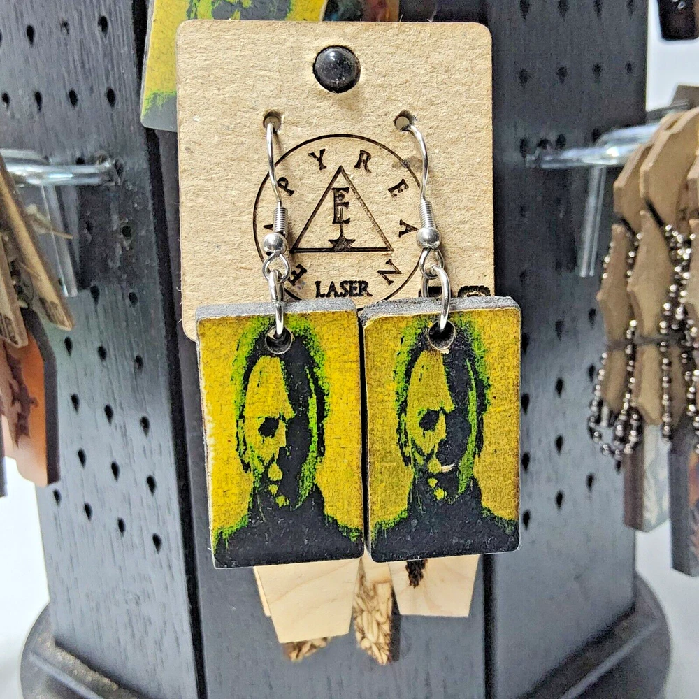 Laser engraved cut michael myers hallowen custom art earrings horror fashion Sketched a pic of Michael Myers on tablet, then transferred design to my laser machine to engrave then cut out earring shapes. They glow under uv light. Pretty funky. Unless you don't want to be seen in the dark. Then you're screwed. You'll look awesome with these though. You have that going for you at least. Measures 1.25"h x .75"w x 1/4"d. Loaded with hypoallergenic metal ear hooks. Check out plenty of other lasered creations of mine in shop. Order a few pieces and I'll give you a bundled art deal. Not doing customs at the moment but may be persuaded to fire up the laser for right project. Ebay reselling keeps me busy. Message me to find out. Thanks again for visiting my Ebay shop. ***Treasure Suite offers you many pieces of my art prints now*** ###This section is for laser cut sublimation prints of my digital art. Measurements vary by piece. ### *Welcome to my unique collection of digital art, where creativity meets craftsmanship! Each piece in this category features my original digital designs, heat pressed into vibrant sublimation prints on laser cut whiteboard material. Some are engraved then hand painted. These art pieces are not just decorations, they are collectibles that bring a touch of gothic, rock and roll, horror, pin-up, and lowbrow art into your space. *perfect for:* *man cave *castle *bungalow *abode *domicile *penthouse *flat *cabin *studio *boutique hotel *yacht *etc *These pieces make fantastic gifts for art enthusiasts and collectors alike. Who doesn't enjoy vibrant digital art of out of this world space huntresses, demon witches, cyberpunk vixen cyborgs, spooky mistresses, hearses, hotrods, and so on? ***May consider custom orders of laser cut or engraved items.***