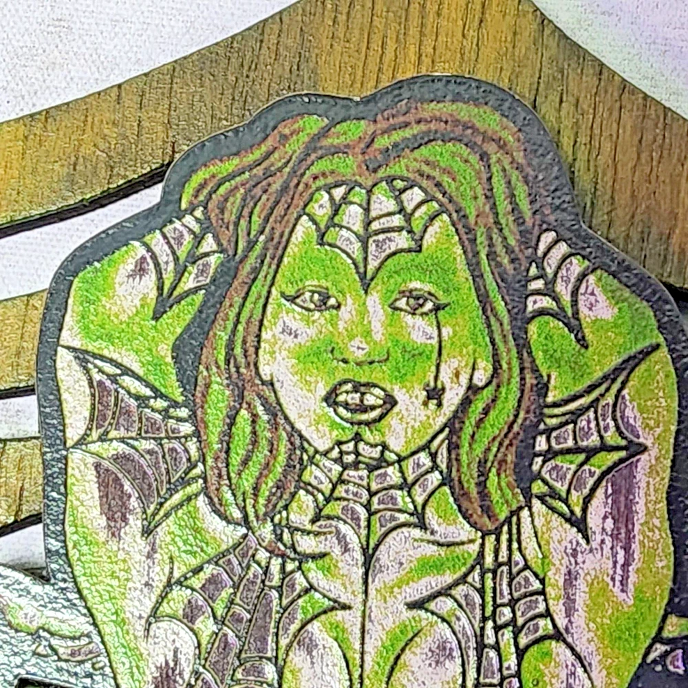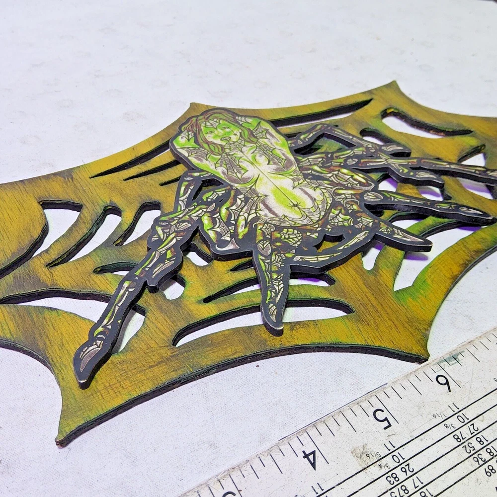 Laser engraved cut spider queen on web digital plywood pinup art 12x7 goth decor