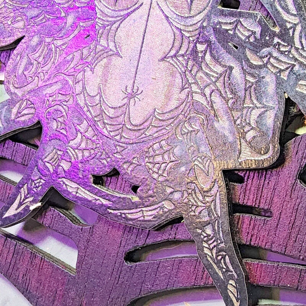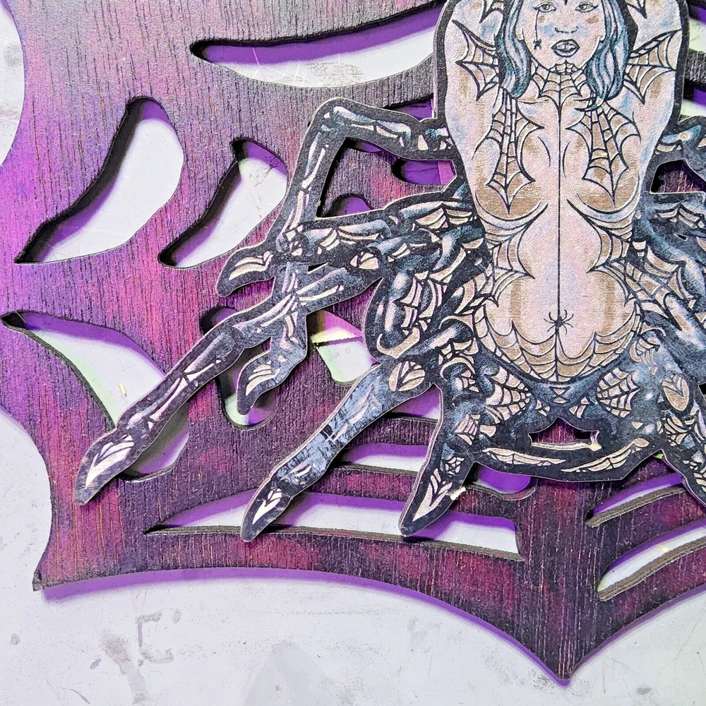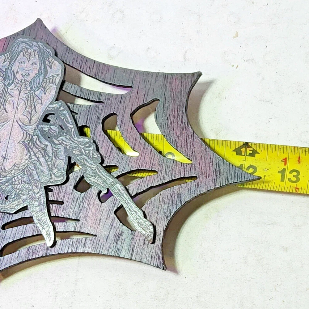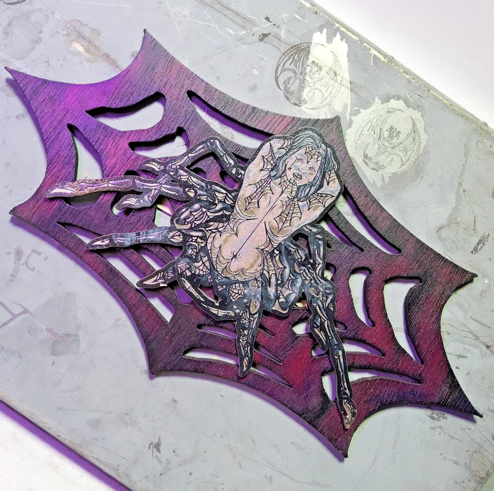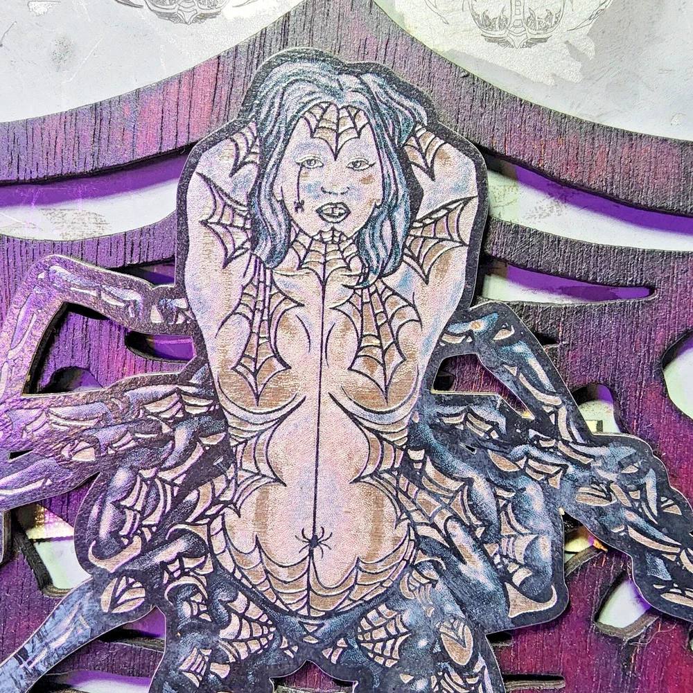 Laser engraved cut spider queen on web digital plywood pinup art 12x7 goth decor