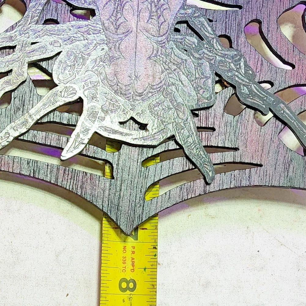 Laser engraved cut spider queen on web digital plywood pinup art 12x7 goth decor horror sci-fi fantasy fiction cryptid Based off my digital art of an alluring spider/woman hybrid queen art. Notice spider hanging from web as her teardrop. I have a large detailed sublimation laser cut print here minus the web. Please check it out. Magnetic. Quite a bit of work goes into making my laser cut/engraved art. I come up with most of art/shapes,draw them out,edit colors,sizes, transfer files to multiple formats,paint,assemble,etc. Lots of steps to get some fine off the wall pieces. From tablet,to you. Can give bundle deal for multiple pieces. Not entertaining custom pieces at this moment. ***Treasure Suite offers you many pieces of my art prints now*** ###This section is for laser cut sublimation prints of my digital art. Measurements vary by piece. ### *Welcome to my unique collection of digital art, where creativity meets craftsmanship! Each piece in this category features my original digital designs, heat pressed into vibrant sublimation prints on laser cut whiteboard material. Some are engraved then hand painted. These art pieces are not just decorations, they are collectibles that bring a touch of gothic, rock and roll, horror, pin-up, and lowbrow art into your space. *perfect for:* *man cave *castle *bungalow *abode *domicile *penthouse *flat *cabin *studio *boutique hotel *yacht *etc *These pieces make fantastic gifts for art enthusiasts and collectors alike. Who doesn't enjoy vibrant digital art of out of this world space huntresses, demon witches, cyberpunk vixen cyborgs, spooky mistresses, hearses, hotrods, and so on? ***May consider custom orders of laser cut or engraved items.***