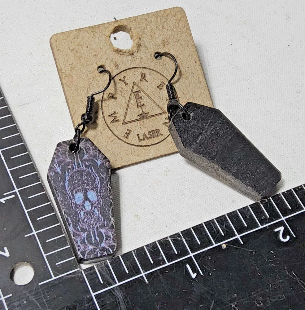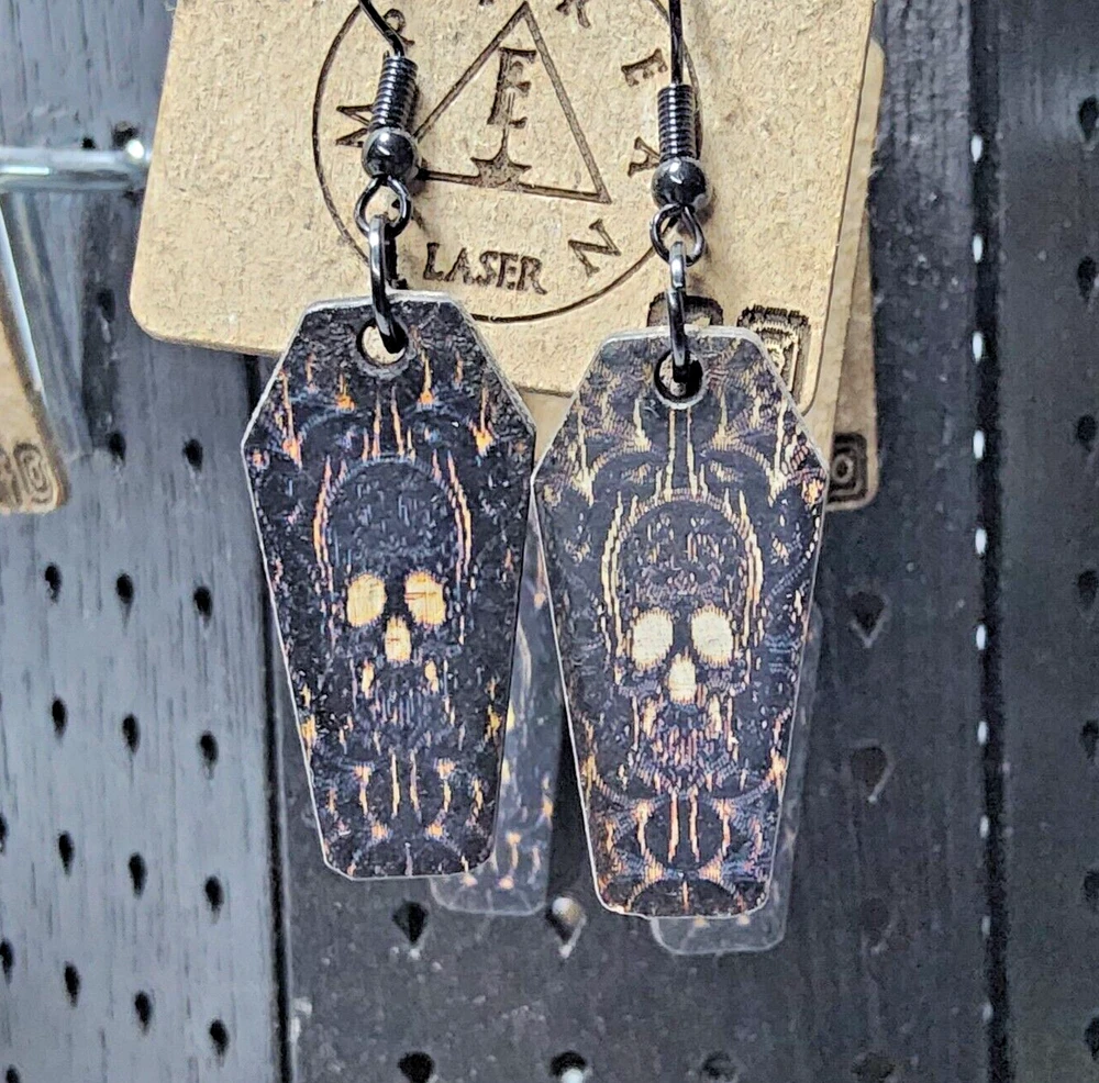 Laser engraved cut sugar skull themed earrings hallowen custom art horror fashion purple,cream, and black western coffin Made from one of my sugarskull coffin designs on laser cutter/engraver. No 2 are alike, so you will get slight variation from pics. Measures 1.5"h x .75"w x 1/4"d. Loaded with hypoallergenic metal ear hooks. Check out plenty of other lasered creations of mine in shop. Order a few pieces and I'll give you a bundled art deal. Not doing customs at the moment but may be persuaded to fire up the laser for right project. Ebay reselling keeps me busy. Message me to find out. Thanks again for visiting my Ebay shop. ***Treasure Suite offers you many pieces of my art prints now*** ###This section is for laser cut sublimation prints of my digital art. Measurements vary by piece. ### *Welcome to my unique collection of digital art, where creativity meets craftsmanship! Each piece in this category features my original digital designs, heat pressed into vibrant sublimation prints on laser cut whiteboard material. Some are engraved then hand painted. These art pieces are not just decorations, they are collectibles that bring a touch of gothic, rock and roll, horror, pin-up, and lowbrow art into your space. *perfect for:* *man cave *castle *bungalow *abode *domicile *penthouse *flat *cabin *studio *boutique hotel *yacht *etc *These pieces make fantastic gifts for art enthusiasts and collectors alike. Who doesn't enjoy vibrant digital art of out of this world space huntresses, demon witches, cyberpunk vixen cyborgs, spooky mistresses, hearses, hotrods, and so on? ***May consider custom orders of laser cut or engraved items.***