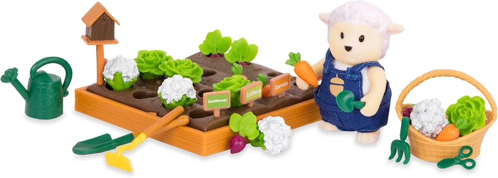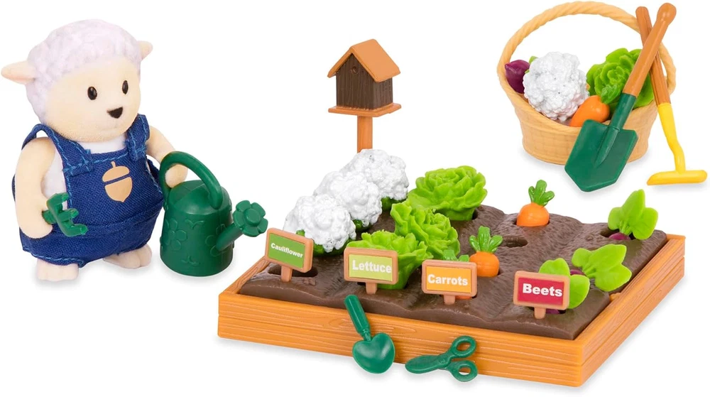 Garden Playset: Gardening playset with toy food for Li'l Woodzeez figurines. Includes: Garden toy playset comes with toy sheep, vegetables, and gardening tools. Encourages Imagination: Your Li’l Woodzeez friends can enjoy a day of gardening! Plays Well: Compatible with all your Li’l Woodzeez figurines and most competitors. Recommended Age: Suitable for kids aged 3 and over. Who’s ready to get their paws green? The Garden Set is the perfect addition to your Li’l Woodzeez collection! This miniature playset includes a vegetable garden, with beets, cauliflower, carrots, and lettuce. Jake Snipadoodles, a cute sheep character, is here to help with his basket and watering can! Also included is a rake, hoe, shovels, and a pair of scissors to get the job done. There is even a little toy birdhouse so your feathered friends can fly over to say hello! The Garden Set is an ideal gift for kids who love to use their imagination. Li’l Woodzeez toys are recommended for 3 year olds and up.