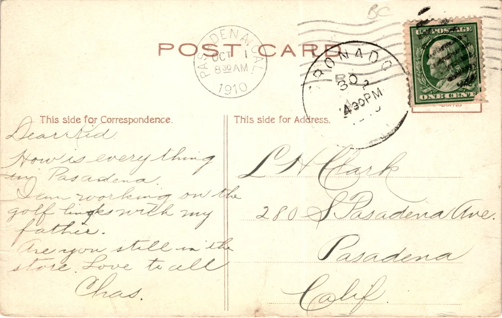 MAKE AN OFFER. THE MORE YOU BUY THE BETTER DEAL I WILL ACCEPT The postcard is postmarked from Philadelphia, Pennsylvania, in 1910 and features an image of the Liberty Bell. The front of the postcard includes a message from someone in Pasadena, California, asking about Mark's well-being and mentioning working on the golf links with their father. The sender also inquires about Mark's whereabouts and mentions their current location in Pasadena.