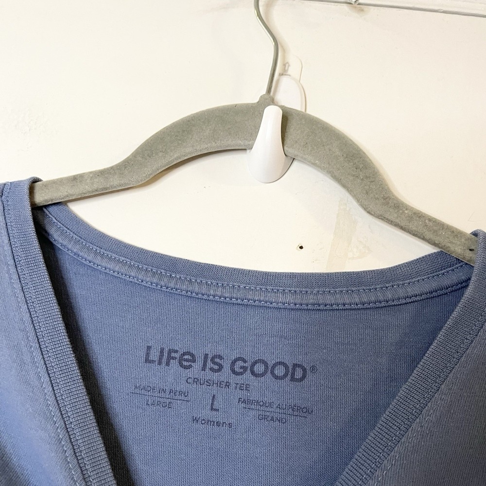 Excellent pre-owned condition, no flaws or stains 20" armpit to armpit 26" long The Life Is Good Women's Blue T-Shirt is a comfortable and stylish addition to any woman's wardrobe. Featuring a crew neckline and pullover closure, this shirt is perfect for casual or travel occasions. The graphic design of a dog adds a playful touch, while the 100% cotton fabric ensures easy care and durability. Available in size L, this shirt is suitable for all seasons and is machine washable for convenient maintenance. Perfect for those who appreciate both comfort and style in their clothing choices.