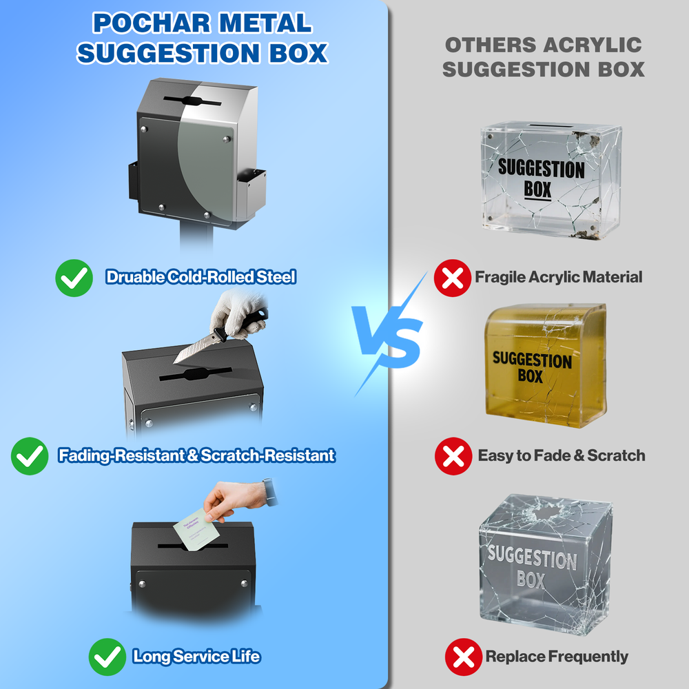 POCHAR Metal Donation Box for Fundraising - Suggestion Box with Stand, Slot & Lock - Locking Offering Boxes for Church, Floor Standing Prayer Voting Collection Ballot Boxes for Charity Election Events About this item FLOOR STANDING SUGGESTION BOX: POCHAR comment box features a robust steel stand and base with suction cups, ensuring the steady that does not shake or move during using. Made from durable cold-rolled steel, this comment box is engineered for long-term in high-traffic environments, unlike fragile acrylic alternatives. DONATION BOX WITH LOCK: This donation box for fundraising features a secure key lock on the side door (with 2 keys), keep the donations, ballots, or interior items security and privacy. And the voting box is equipped with a clear acrylic display plant for posters, announcements, or instructions to encourage participation. LARGE STORAGE SPACE: Standing at 41.7" tall, the offering box has a slot measuring 6.5" x 0.2", accommodating money, ballots, keys, cards or envelopes up to 6" wide. With a spacious storage capacity of 692.78 cubic inches, you won’t need to open it frequently due to fullness. MULTI-PURPOSE: Two side trays hold suggestion cards, questionnaires, brochures, or envelopes for easy access. Ideal as a offering box or prayer request box for churches, wedding card box, lobby or reception suggestion box, voting box for elections or schools, and key return collection box in car rental centers or hotels. HASSLE-FREE ASSEMBLY: Includes clear instructions for quick setup in just four steps. Start collecting feedback, ballots, or donations immediately. Perfect as collection box, raffle ticket box, advice box, complaint box or business card drop box for churches, hospital programs, offices, charity events, election centers, community organizations and public spaces. Check our eBay Store Front for more product listings! POCHAR Sales | eBay Stores Thanks for shopping POCHAR! The actual color of the product may be different from the image you see. This is due to the fact that every computer monitor, laptop, tablet and phone screen has a different capability to display colors and that everyone sees these colors differently. We try to edit our photos to show all of our products as life-like as possible, but please understand the actual color may vary slightly from your monitor.