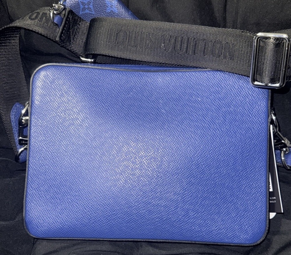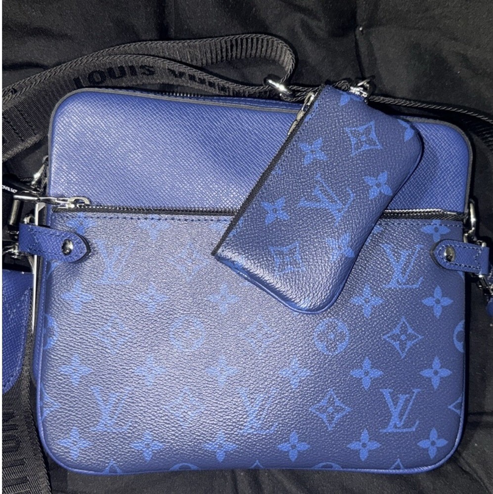 This Louis Vuitton Trio Messenger Bag in blue canvas is a stylish and functional accessory for women. With a rectangle shape and coated finish, it features a zip closure and a black handle with a drop range of 15.5-24.5 inches. The bag comes with a pouch, coin purse, and original dust bag, making it a complete set. The bag has a width of 10 inches, a height of 7.5 inches, and a depth of 2 inches. The exterior is made of durable canvas material, and the lining is black fabric. The hardware color is gunmetal, and the bag belongs to the Louis Vuitton Trio product line. This messenger bag is perfect for everyday use and is sure to add a touch of luxury to any outfit.