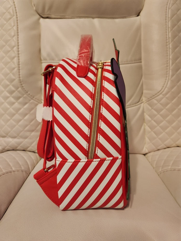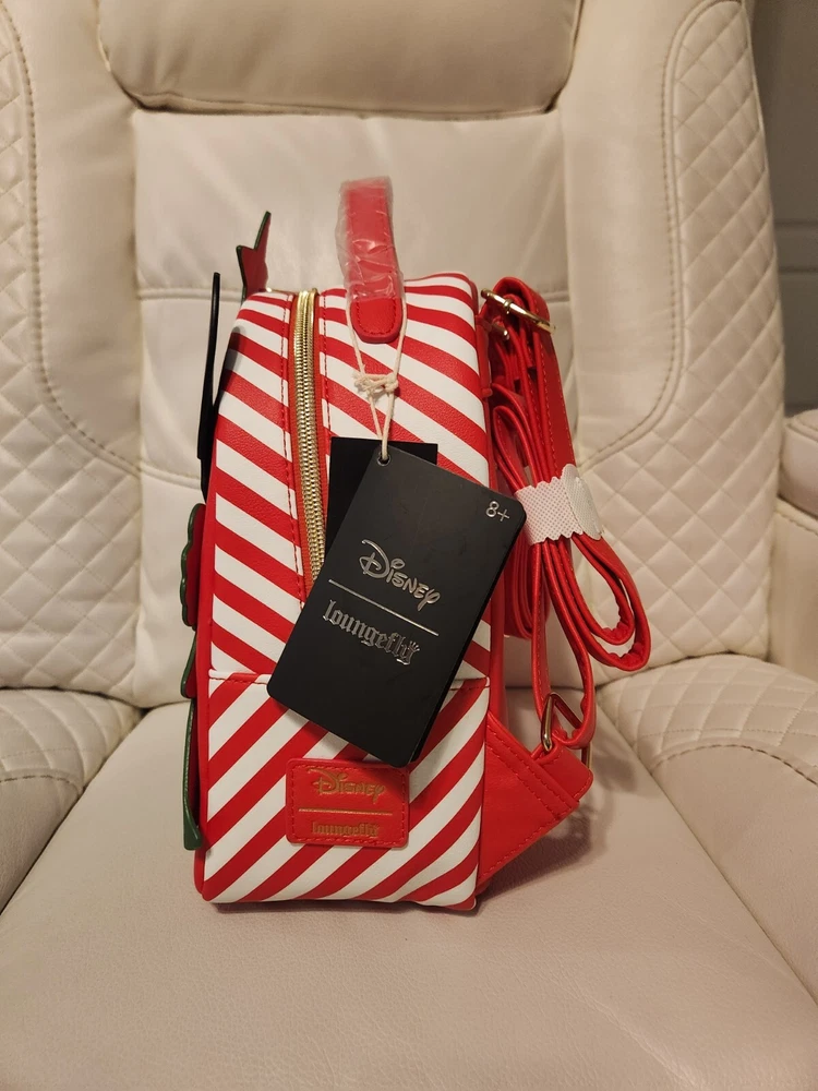 Show off your festive spirit with this Stitch figural mini backpack. It has an appliqued Stitch dressed as a Christmas tree holding a hibiscus ornament and candy cane. The sides have candy cane striping. Adjustable straps and interior pocket. 9" x 4" x 10 1/2" Polyurethane