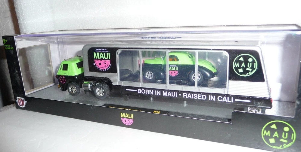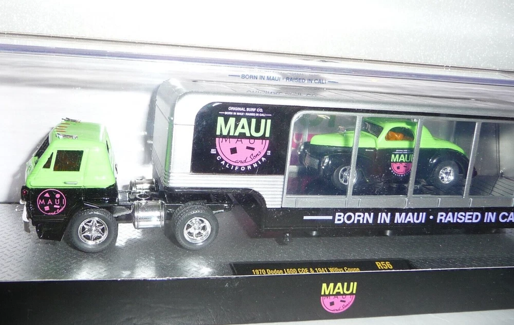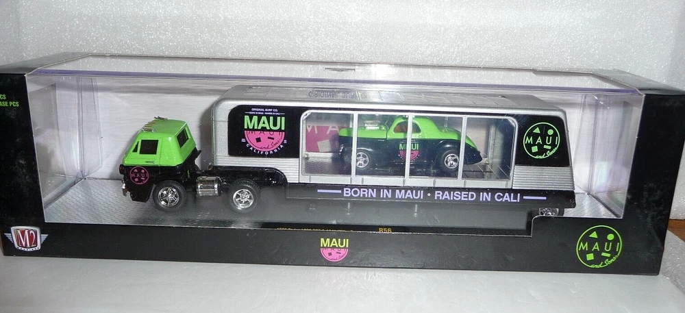 M2 Machines Maui 1970 Dodge D100 COE Transport & 1941 Willys coupe 1:64 Diecast. Cars are new in package. Box has light wear. Includes an acrylic display case.