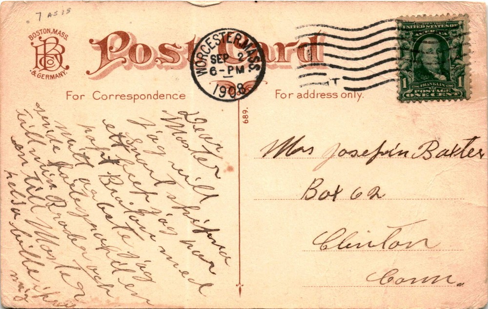 MAKE AN OFFER. THE MORE YOU BUY THE BETTER DEAL I WILL ACCEPT The postcard features an image of Main Street in Worcester, Massachusetts, specifically from the Harrington Corner. The postcard is addressed to Miss Josefin Bakter in Clinton, Massachusetts, with a one-cent postage stamp from the United States of America.