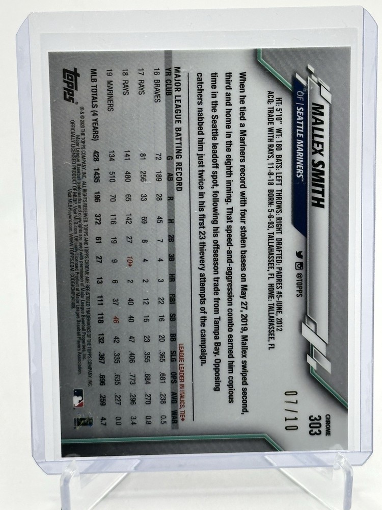 The product is a 2020 Topps Chrome Sapphire 303 Purple Refractor trading card featuring Mallex Smith of the Seattle Mariners. This limited edition card is numbered 07/10, making it a highly sought-after collectible for baseball fans and card collectors. The card is part of the Topps Chrome Sapphire Edition set, known for its high-quality and vibrant refractor designs. Perfect for fans of Major League Baseball looking to add a unique and rare piece to their collection.