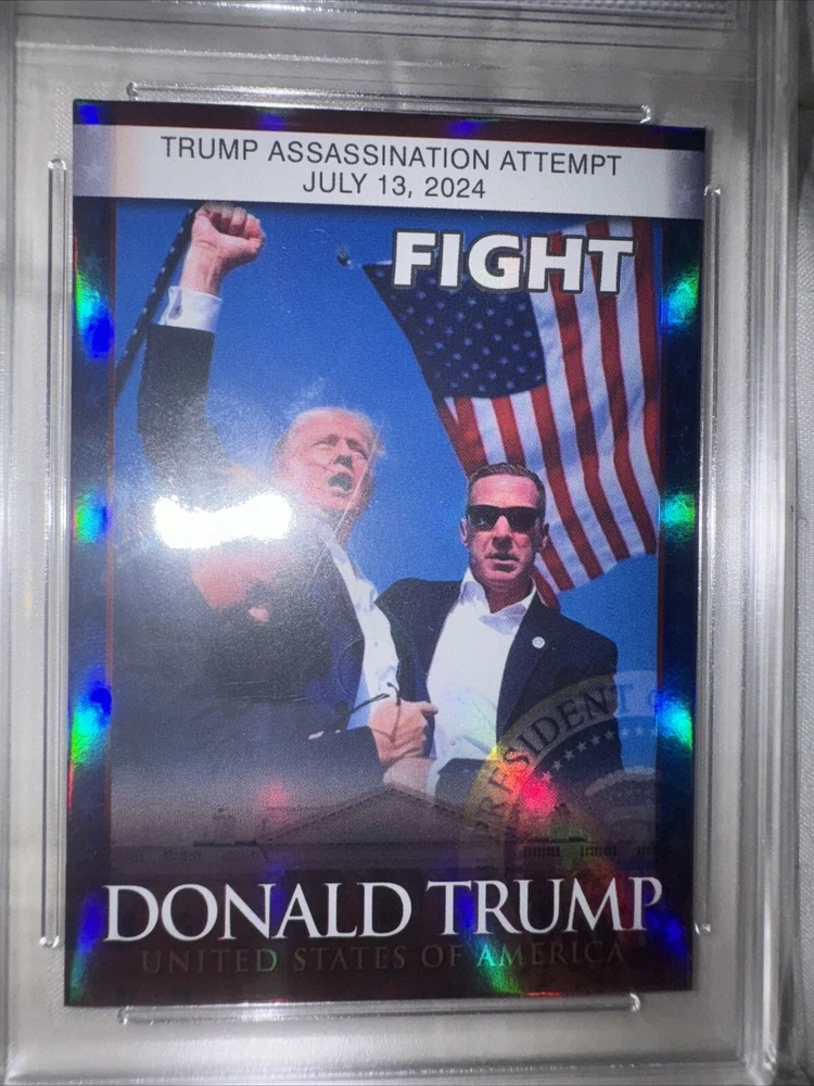 This Merrick Mint Donald Trump 2024 Assassination Attempt Card is a must-have for any collector of non-sport trading cards. This exclusive and collectors edition card features a chase design, with a standard size made from high-quality card stock material. The card is part of the Election set, with a parallel/variety that makes it unique from other cards. The card is in excellent shape, with no autograph, and is perfect for those interested in political, history, and military genres. It features Donald Trump, a famous US President, and is part of the US Presidents, Heroes, and Politics franchise. This card is a great addition to any trading card collection, and it is sure to impress.