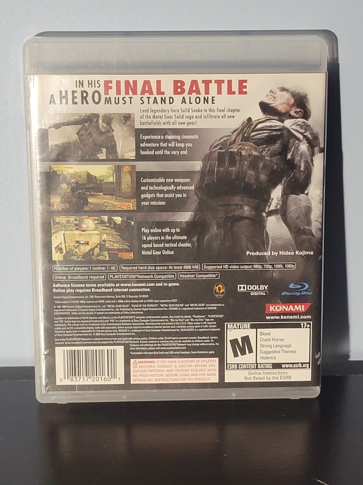 Game Name:Metal Gear Solid 4: Guns of the Patriotsgtin13:0083717201601Genre:Action & AdventureRelease Year:2008Features:Travel to the Middle East, South America, and other international locales while tracking the evil Liquid Ocelot Use new gadgets like the "Solid Eye" and "OctoCamo" suit to avoid detection from armed guards Features online suppRating:M - MatureVideo Game Series:Metal Gear SeriesPublisher:KonamiUPC:0083717201601Platform:Sony PlayStation 3MPN:6RU5HLPNRQCK