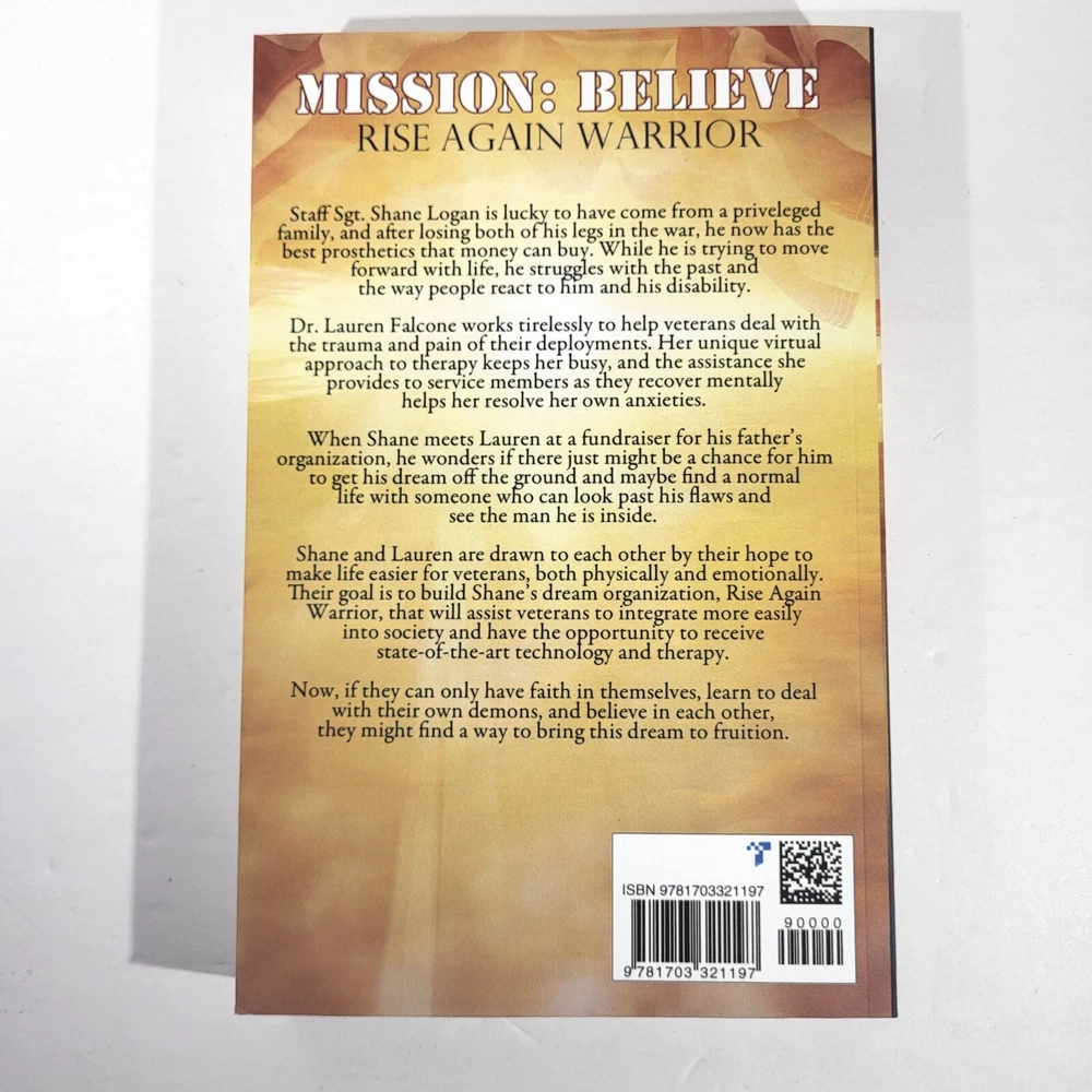 Mission: Believe by Stacy Eaton Signed Pre-Owned Rise Again Warrior #1 2019 [310] Like New Condition Staff Sgt. Shane Logan is lucky to have come from a privileged family, and after losing both of his legs in the war, he now has the best prosthetics that money can buy. While he is trying to move forward with life, he struggles with the past and the way people react to him and his disability. Dive into the world of war and military with Stacy Eaton's "Mission: Believe". This fiction novel is part of the Rise Again Warrior series and has been signed by the author herself. The first edition was published in 2019 by Independently Published and consists of 358 pages. The trade paperback format of the book has a length of 6 inches, a height of 9 inches, and a width of 1 inch. The book is in English and the original language is also English. The intended audience of the book is adults. This pre-owned copy is in like-new condition and weighs 17 ounces. Get your hands on this captivating novel now!