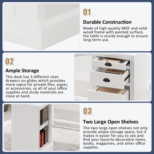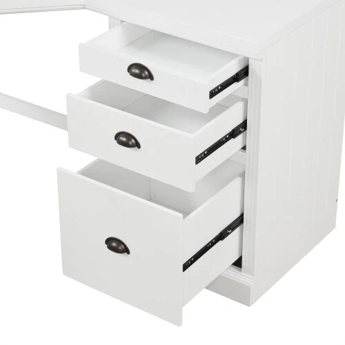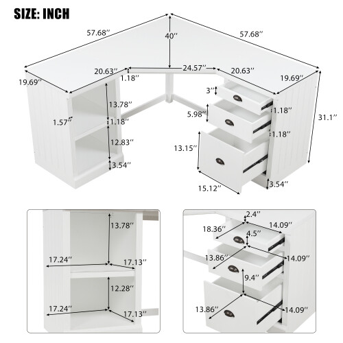 L Shaped Desk with Charger, Computer Desk with Drawers, Bookshelf & Hutch, Black 305.15 USD Free shipping Amiel All Purpose Gray Finish Writing Desk for Study 263.54 USD Free shipping Sit-to-Stand Rolling Adjustable Height Laptop Cart With Storage, Woodgrain 124.54 USD Free shipping L Shaped Desk, Computer Desk with Drawers, Bookshelf & Hutch,with LED Light 322.8 USD Free shipping White Computer Desk with 4-in-1 Socket, the Desk with 3 Slide Drawers 206.95 USD Free shipping Product Description Specification Product Information Product Type: Combo Item Product Name: 57.68" Modern L Shaped Executive Desk with 2 Storage Cabinets and 3 Drawers,Corner Writing Desk,Office Desk Furniture,Computer Desks with Depth Workstation for Home Office,Living room,White Main Color: White Main Material: Solid Wood+MDF Product Dimensions Assembled Length (in.): 57.68 Assembled Width (in.): 57.68 Assembled Height (in.): 31.10 Weight (lbs.): 145.51 Package Size Sub-item 1: N751P225872K Package Quantity: 1 33.3 * 22.1 * 9 in. 52.91 lbs. Sub-item 2: N751P225871K Package Quantity: 1 43 * 43 * 7.5 in. 110.23 lbs. Product Features Wide Desktop for those who work with multiple devices or office supplies at once, this wide desktop helps keeping everything you need within reach and Improving productivity without cluttering your workspace. The product has exquisite designs on all four sides.It is a great choice whether you put the product against the wall or in the middle of the living room,which adds charming colors to the study or living room. The two large open shelves not only provides ample storage space, but makes it easier for you to see and find your favorite decorative items, books, magazines, and other office supplies.what’ more, it also adds a touch of refinement for your office place. Made of high-quality MDF and solid wood frame with painted surface, the table is sturdy enough to ensure long-term use.The thick, high-quality tabletop provides a sturdy capacity of up to 220 lbs, making it highly practical. Made of high-quality MDF and solid wood frame with painted surface, the table is sturdy enough to ensure long-term use.The thick tabletop provides a sturdy capacity of up to 220 lbs, making it highly practical. This desk has 3 different sizes drawers which provides more space for private files,papers,or accessories,so all of your office supplies and study materials are close at hand. Description Classic L-shaped desk The product has exquisite designs on all four sides.It is a great choice whether you put the product against the wall or in the middle of the living room,which adds charming colors to the study or living room. two large open shelves The two large open shelves not only provide ample storage space, but it makes it easier for you to see and find your favorite decorative items, books, magazines, and other office supplies. AMPLE STORAGE This desk has 3 different sizes drawers which provides more space for private files,papers,or accessories,so all of your office supplies and study materials are close at hand. Spacious L-shape Desktop This modern L-shaped desk combines a spacious tabletop, providing ample space for your computer, books, office documents, and other decorative items. More information Product Name Executive Desk Color White Style Modern Shape Rectangle Frame Material Solid Wood Board Material MDF Finish Type Painted White Finish Capacity 220lbs/Table Number of Adjustable Shelf Null Adjustable Feet Null Number of Drawers 3 Number of Doors Null Number of packages 2 Assembly Required About 60 Minutes Country of Origin Vietnam Notice Suggested Number of People for Assembly/Install 1-2 Size Manual measurement has been used, there may be some reasonable error Color Real product's color may be a little different from the image due to the lighting or monitor's display. Product Care To protect finish, do not apply abrasives or household cleaners, dust with soft wet cloth. About Us Shipping Returns Contact Us 1.If you like our Product,Service,Delivery Time,Free Postage, please leave us a 5 Stars Positive Feedback! 2.Please feel free to contact us if you have any questions before you leave a (Neutral or Negative) feedback! We will try our best to solve the problem and make you satisfied. Thank you so much and have a nice day! We ONLY ship to USA . Orders processed within 24-48 hours of payment verification. Before buying, Please make sure your ebay address is correct. Or not, please correct it before payment. We are very sorry we do not support combine postage. If you have not received your shipment within 15 days from payment, please contact us. We will track the shipment and get back to you as soon as possible with a reply. Our goal is customer satisfaction! Due to stock status and time differences, we will choose to ship your item from our first available warehouse for fast delivery. Delivery Time: Ship from USA via UPS or Fedex, about 5-10 days for the shipping time. Return is accepted within 30 days after the buyer's receiving the item. If this item is defective upon receipt, customer has up to 30 days from date of receipt for exchange of a new one. If you are not completely satisfied with your purchase, you may return it to us for a prompt exchange or we will refund your payment. Unused/unopened merchandise will be fully credited. Please note that all purchases must be returned within 30 days of purchase. NO return or exchange will be accepted after 30 days from the date of purchase. After getting the returned item, we will refund the customer at the item's price ( excluding the shipping costs to and fro ). 1.Customer is always NO.1 2. All selling products are brand new, never been used and not refurbished 3. We care about our valued customers and understand the concerns and frustrations you might have, and we will try our best to resolve the issues. About Us 1.If you like our Product,Service,Delivery Time,Free Postage, please leave us a 5 Stars Positive Feedback! 2.Please feel free to co