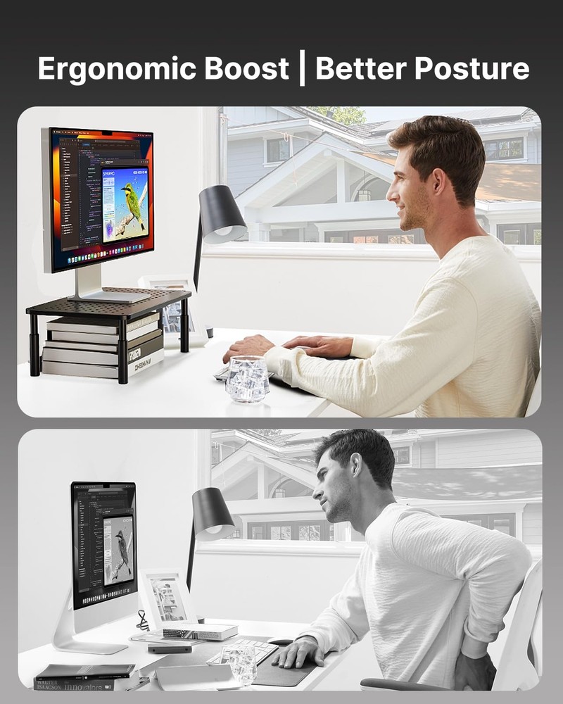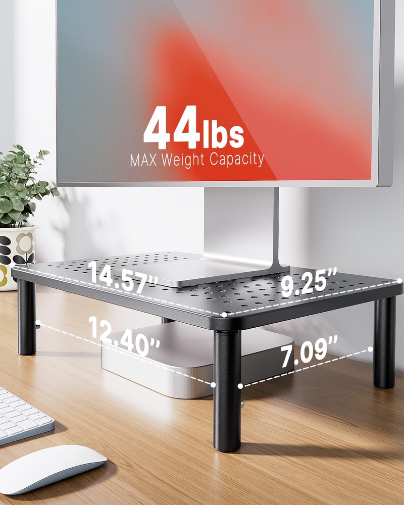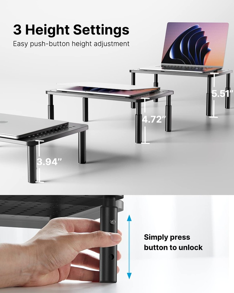 ERGONOMIC HEIGHT ADJUSTMENT: This monitor stand features 3 height settings at 3.94”, 4.72”, and 5.51” tall. Choose the most comfortable and ergonomic viewing height by pressing the buttons on the legs to adjust the stand. DESKTOP ORGANIZER: This computer monitor stand provides 12.40” x 7.09” storage space underneath the platform to organize office supplies. Stack two monitor stands together to double the functionality of your workspace. EFFECTIVE HEAT DISSIPATION: The monitor riser is made of powder-coated steel with a ventilated platform designed to improve heat dissipation. The ventilation helps to keep your laptop cooler and avoid overheating. WIDE COMPATIBILITY: The monitor stand riser supports up to 44 lbs to hold monitors, laptops up to 15.6”(Width< 9.25''), printers, gaming consoles, and more. The anti-slip rubber pads add stability and protect surfaces from scratches. EASY ASSEMBLY: Tools are not required for the monitor stand assembly. Simply screw the four legs onto the preassembled bolts of the monitor stand riser platform. Have your desk organized for more productivity in no time.
