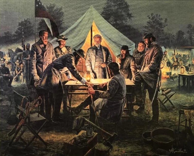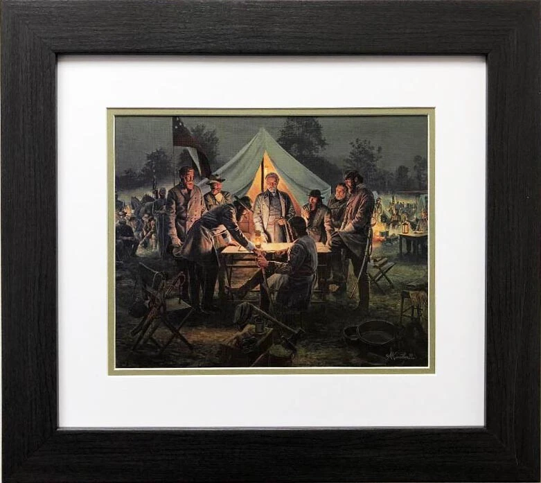 Mort Künstler "Sharpsburg War Council" This Artwork is: NEW CUSTOM FRAMED in a gray colored frame Double Matted in Green & White Plate Signed Framed Size : 17.5" x 19.5" Image Size: 11" x 9.25" Hanging hardware included on back of frame Looking for other framing choices? Contact us! Visit our store for other Mort Künstler listings... makes wonderful pairs or groupings! THE FRAMING ALONE IS WORTH OVER $125 Historical Information It had been the war's bloodiest day. The fighting had begun at dawn and had raged all day among the fields and forests near Sharpsburg, Maryland. General Robert E. Lee's army of 51,000 troops had faced a superior force of 75,000 Federals commanded by General George B. McClellan. who was also armed with a lost copy of Lee's troop deployments. By day's end, obscure local landmarks - the Sunken Road, Burnside's Bridge, the East Woods, Dunkard Church - had earned battlefield fame through fire and blood. When numbers were finally counted, the cost of a single day of battle at Sharpsburg would be more than 26,000 casualties. The common soldiers on both sides had again established their reputations for valor and sacrifice. On the night of the battle, Lee assembled his key commanders outside his headquarters tent. Should they stay and fight, or should they retreat? In the end, the hard choice was left to Lee - and he chose to face the enemy again the next day. When dawn came on the 18th, Lee's Army of Northern Virginia would be in place and ready to receive another enemy attack. Mercifully, the Federal Army of the Potomac was equally battered, and General McClellan chose to avoid further engagement. The two bloodied armies glowered at each other for most of the day, but the battle was not renewed. After sundown on the 18th, the Army of Northern Virginia withdrew from the field on Lee's orders. His attempted invasion of the North had been turned back, and his army had been severely mauled. But despite the superior numbers arrayed against them, Lee's legions had held their own - and they would fight again. Mort Künstler's Comments When you consider the war's most dramatic moments, one must be the scene at Lee's headquarters the night of the Battle of Sharpsburg. Lee had summoned the members of his high command to a war council outside his headquarters tent. It was virtually a "who's who" of the principal commanders of the Army of Northern Virginia. Jackson was there. So was Longstreet. And A.P. Hill, John Bell Hood, D.H. Hill, Jubal Early and others. What a great opportunity to paint a strategy meeting of Lee and his officers! Lee, standing in the center of the group, is pictured as the central and most commanding figure. (His hand is still bandaged from the fall he had suffered a few weeks earlier.) Leaning over the table is General James Longstreet. It was this evening that Lee referred to him as "my old war horse." Directly behind Longstreet are General Hood , hat in hand, and General D.H. Hill, who has hand to his chin. At the opposite end of the camp table from Longstreet is Hill's famous brother-in-law, "Stonewall" Jackson, contemplating the proposed strategy. Directly behind Jackson is General Early - with his hat off - and between Early and Lee is the irrepressible A.P. Hill. Seated with his back to the viewer is General D.H. Jones, who would die of heart trouble before the war's end. In the background of the painting are various staff officers, aides, and couriers, who are seen discussing the day's events. I used the lighting as a key element to make the painting match the drama of decision-making. The lamp in Lee's tent deliberately silhouettes General Lee, helping make him the center of attention. All the commanders await Lee's decision whether to retreat or again face the familiar enemy in the morning. Imagine so many great leaders looking to you for direction. Lee's burden must have been immense, but as always, he shouldered it with grace. Knowing the terrible cost this day's fighting, one can imagine the difficulty of his decision. To me, this event typifies the responsibility of command. Mort Künstler Biography Mort Künstler is regarded by many as the leading contemporary painter of Civil War scenes. His work is esteemed for its dramatic intensity and for an extraordinary level of authenticity that results from intensive research. Dr. James I. Robertson Jr., the noted Civil War historian and author of the biography, Stonewall Jackson, says, “Mort Künstler is the foremost Civil War artist of our time – if not of all time.” Harold Holzer, a senior official at the Metropolitan Museum of Art and one of the nation’s leading authorities on Abraham Lincoln and the political culture of the Civil War era, says of Künstler: “His art is terrific, and he’s attracted thousands of people to Civil War art.” Pulitzer Prize-winning historian James McPherson agrees, "Of all the artists working in the Civil War field, none captures the human element, the aura of leadership, the sense of being there and sharing in the drama