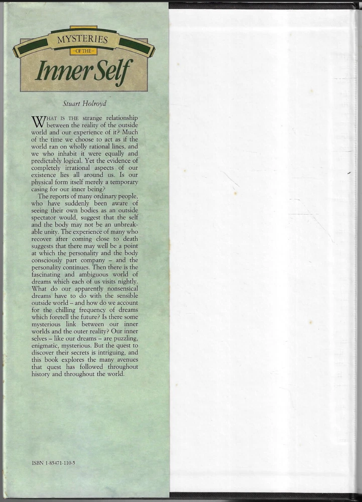 Mysteries of The Inner Self ; by Stuart Holroyd - Large Hardcover Book Mysteries of The Inner Self ; by Stuart Holroyd - Large Hardcover Book This copy is in VERY GOOD used condition overall. The dust-jacket has some edge wear (see scans). The boards and binding are in very good order. The endpapers have some age spots (foxing). The pages DO NOT have any names, inscriptions or marking of text. Click here to visit PATRICK ANDREAS QUALITY BOOKS Store Home Page . Listing and template services provided by inkFrog
