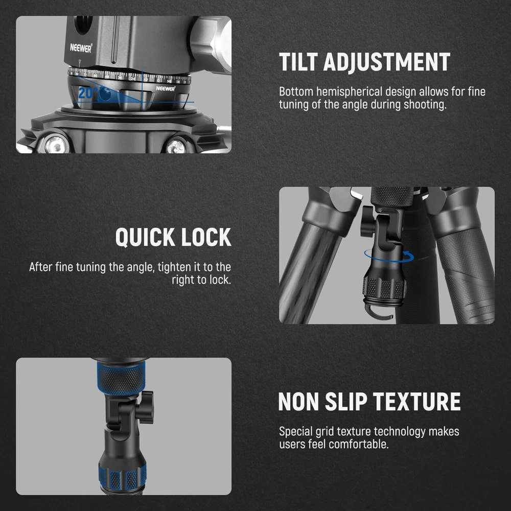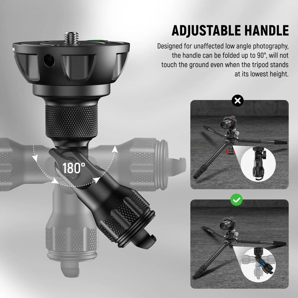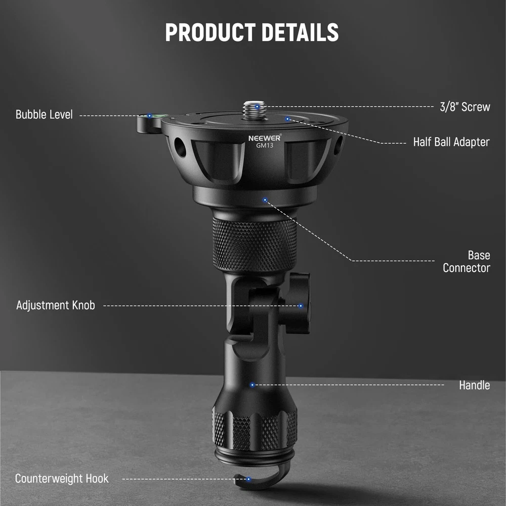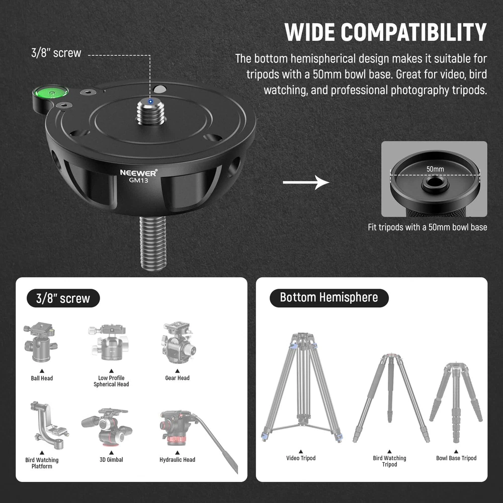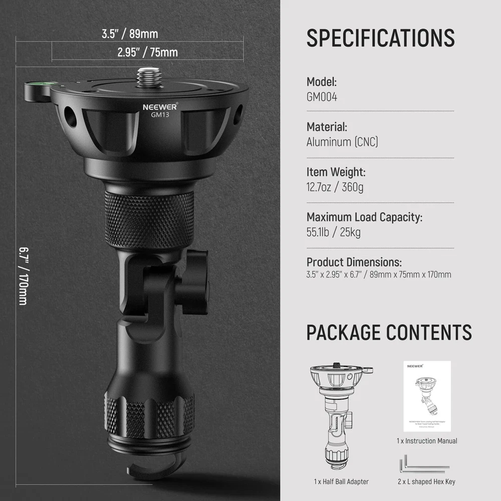 NEEWER 75mm Half Bowl Base Leveling Adapter with 180° Foldable Handle for Tripod/Fluid Head, Aluminum Tripod Leveler with ⌀50mm Bowl Base, Sandbag Hook, 3/8" Screw, Max Load 55lb/25kg, GM004 Description Features: 75mm Half Ball Leveling Adapter Compatible with any 75mm bowl tripods, this half ball leveling adapter lets you achieve ideal angles for panoramic photography and videography. The 50mm smaller bowl base lowers gravity for increased stability for cameras, and allows greater flexibility for unique angles and perspectives when mounted on shooting tripods Ergonomic & Foldable Handle Designed for unaffected low angle photography, the handle can be folded up to 180, will not touch the ground even when the tripod stands at its lowest height, and easily locked with a screw knob. Also upgraded with a widened touch surface of the ergonomic handle for a more secure grip and prevents accidental falling off Solid Construction Engineered with robust CNC aluminum alloy, this professional leveling base is exceptionally durable and suits all weather conditions for being resistant to corrosion, heat, and scratches. Weighing only 12.87oz/365g, this lightweight adapter is heavy duty, and it still boasts a high load capacity of 55lb/25kg 3/8" Mounting Screw With a standard 3/8" mounting screw, this leveler applies to most tripod heads, fluid heads, and gimbal heads accessories on the market Sandbag Hook & Bubble Leveler A hook at the bottom of the handle allows you to hang sandbags for increased stability. A bubble level always help keep the camera in a horizontal position Product Details: Color: Black Brand: Neewer Compatible Devices: Camera Item Weight: 0.84 Ounces Maximum Weight Recommendation: 25 Kilograms Maximum Weight Recommendation: 25 Kilograms Brand: Neewer Compatible Devices: Camera Color: Black Item Weight: 0.84 Ounces Handling We will ship all orders within 3 business days of payment. Delivery We do not ship outside of the Continental US. Feedback We take our reputation seriously, we buy and sell online, so we understand the value of trust. If you are unsatisfied with your order, please contact us and we will work with you to resolve it to your satisfaction.