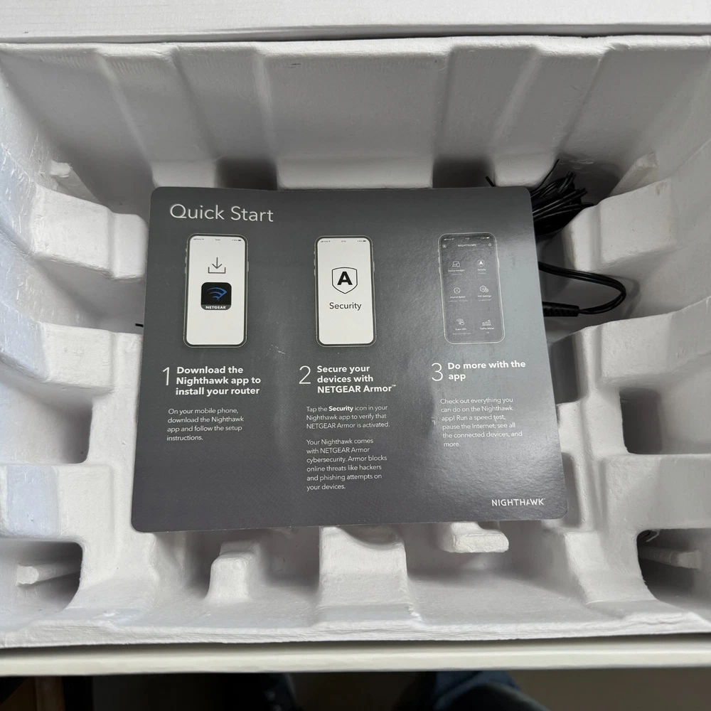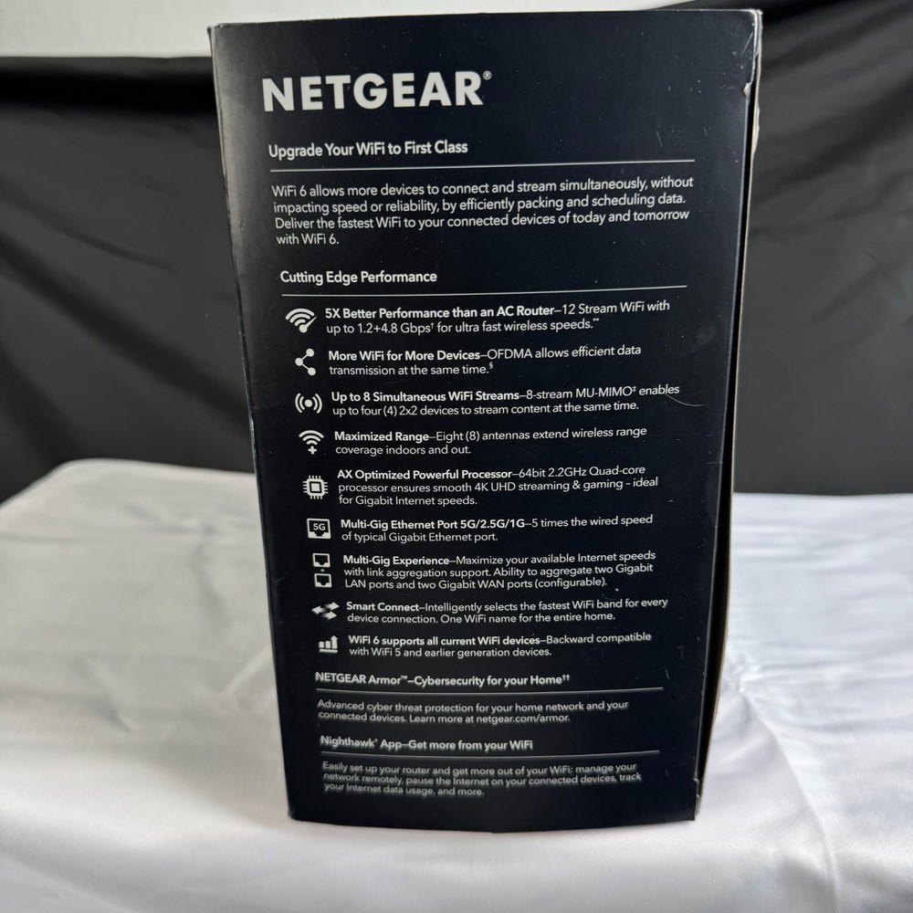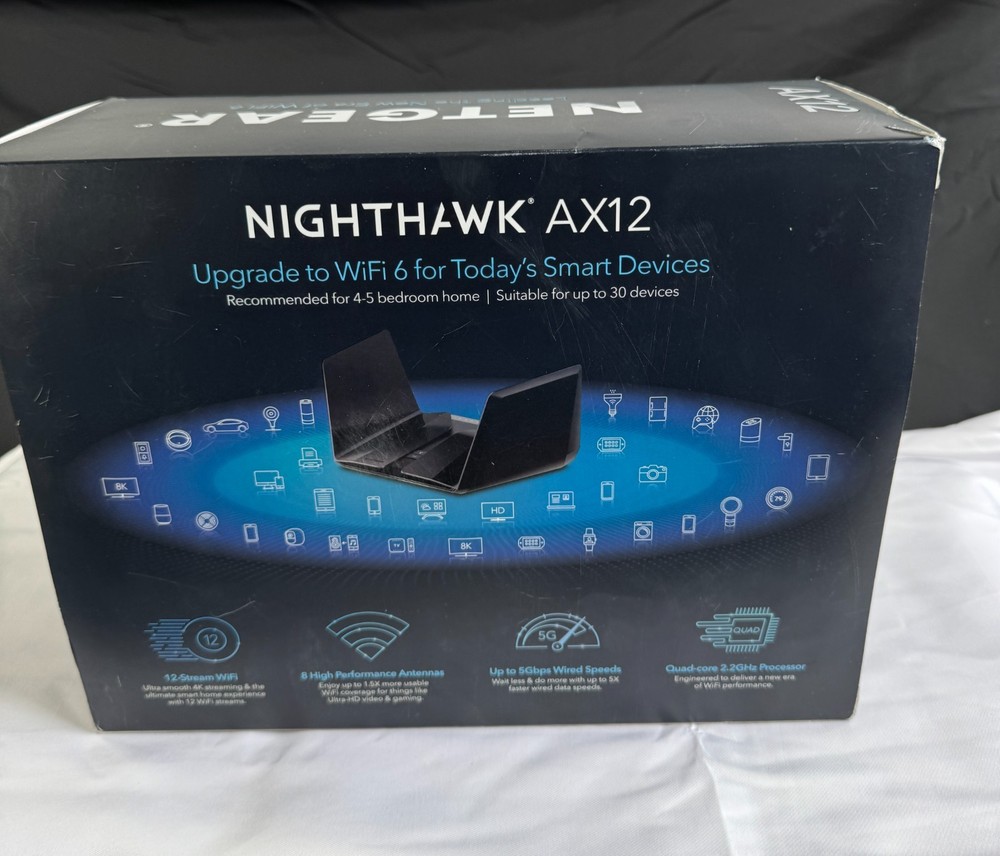 NETGEAR Nighthawk AX12 (RAX120-100NAS) WiFi 6 (802.11ax) router — open box, tested and works . Includes items shown in photos (router, power adapter, Ethernet cable, quick start materials). Cosmetic condition: light handling/storage wear to box; router looks clean. Great for high-speed WiFi, streaming, gaming, and multiple devices.