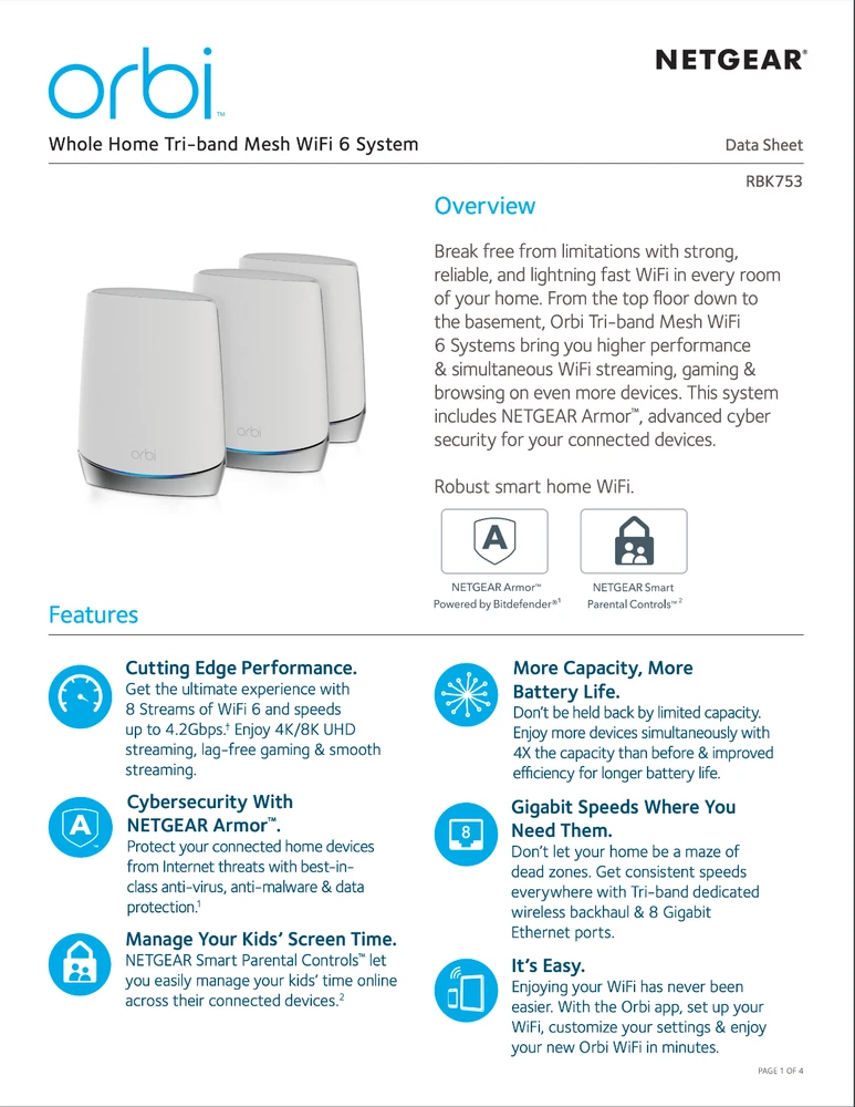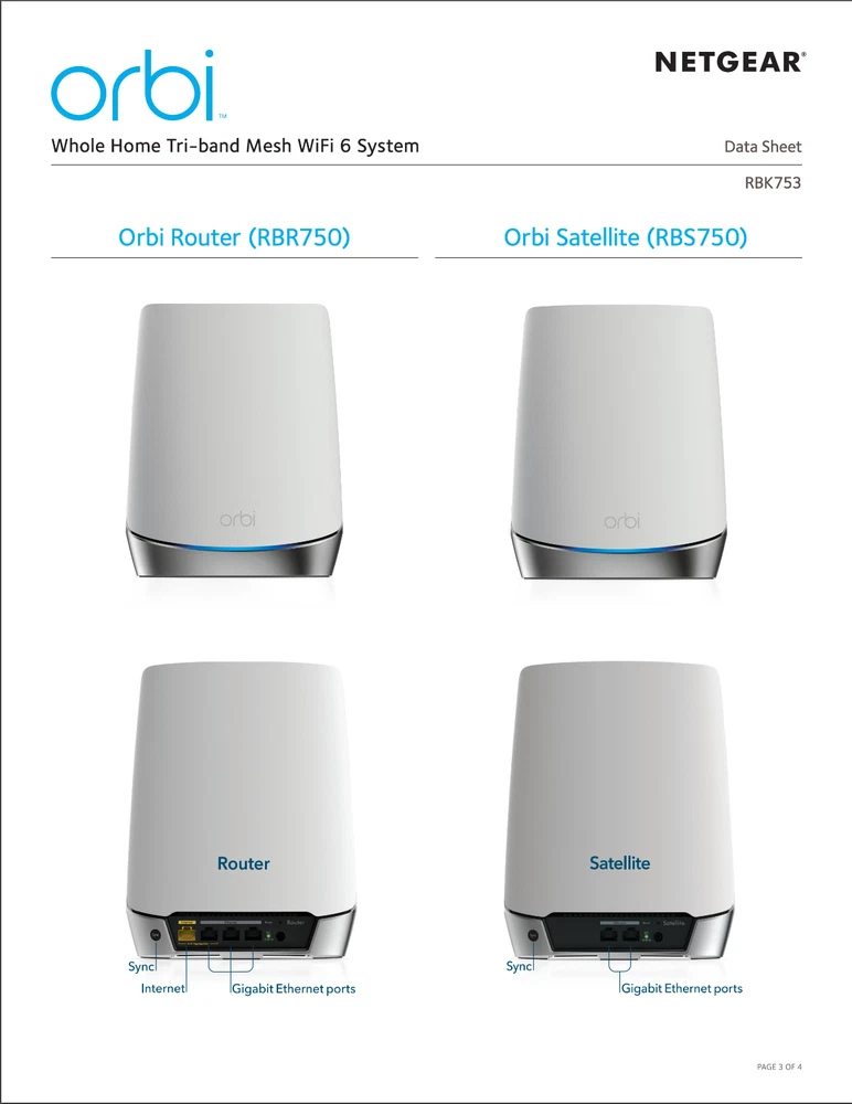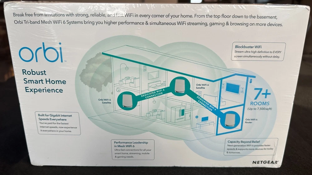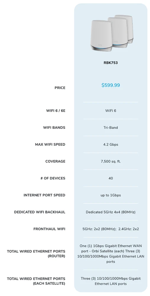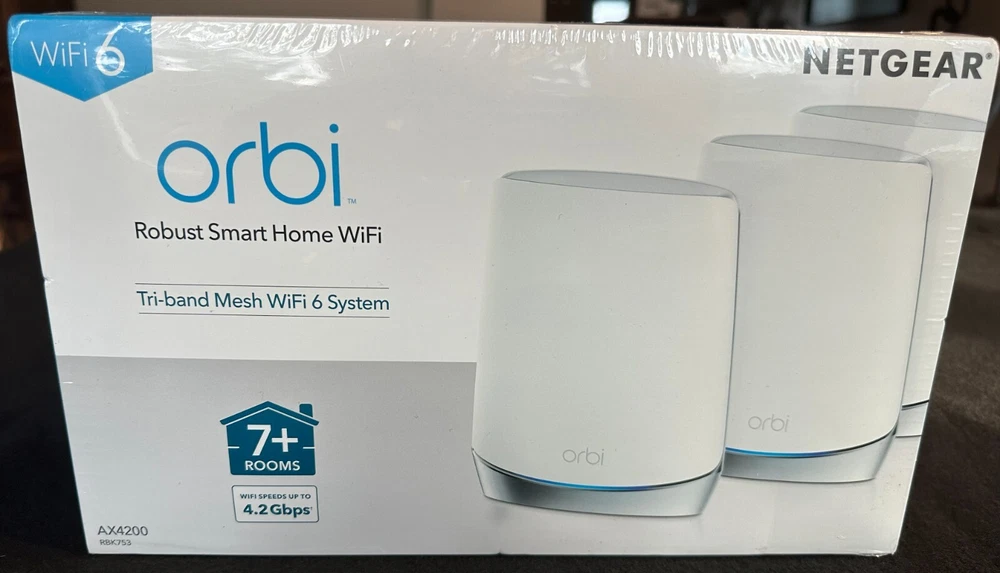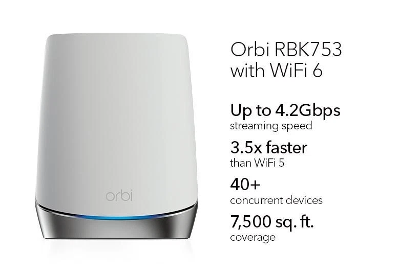 Netgear Orbi RBK753 AX4200 Whole Home Tri-Band Mesh WiFi 6 Router System 3-Pack Description Netgear Orbi RBK753 AX4200 Whole Home Tri-Band Mesh WiFi 6 Router System 3-Pack . Product Detail • Brand : Netgear • Model : Netgear Orbi RBK753 • Color: White • Type : Router Please message me if you have any questions.