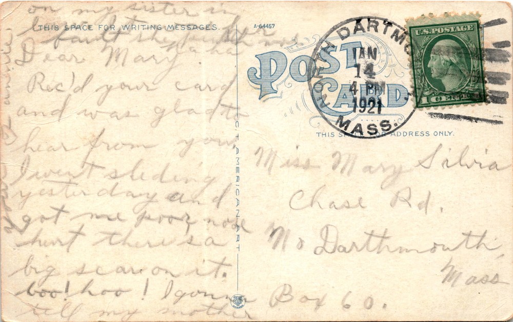 MAKE AN OFFER. THE MORE YOU BUY THE BETTER DEAL I WILL ACCEPT The postcard is a view of the New Bedford and Fairhaven Bridge in New Bedford, Massachusetts. The sender mentions going sliding and getting hurt, as well as receiving a letter from Mary Silvia in Dartmouth.New Bedford is a city in Bristol County, Massachusetts, known for its history as a whaling port.