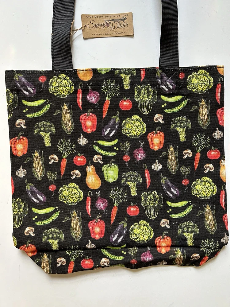 This fantastic tote bag from Sipsey Wilder—a woman-owned, eco-conscious small business from Tuscaloosa, Alabama—is in perfect, brand new condition, with tags. It features adorable “Fresh Veggies” artwork in bright colors over a black background. I love the overall effect of all this produce over black! I also love how sturdy and spacious this bag is! It’s seriously roomy and capable of holding a LOT of stuff! Tote measures 15"H x 15"W x 4"D Double handles Handle drop measures 13 in Limited Edition. From Sipsey Wilder: A healthy harvest of bright and delicious vegetables pop on a black background. Commit to plastic-free shopping! Adorable reusable shopping bags in eye-catching prints! Includes gusseted structure and an inner pocket for your personal items! Measures 15" x 15" x 4" with a 13" drop strap Includes open pocket inside for personal items or small items. Gusseted structure Cotton Canvas