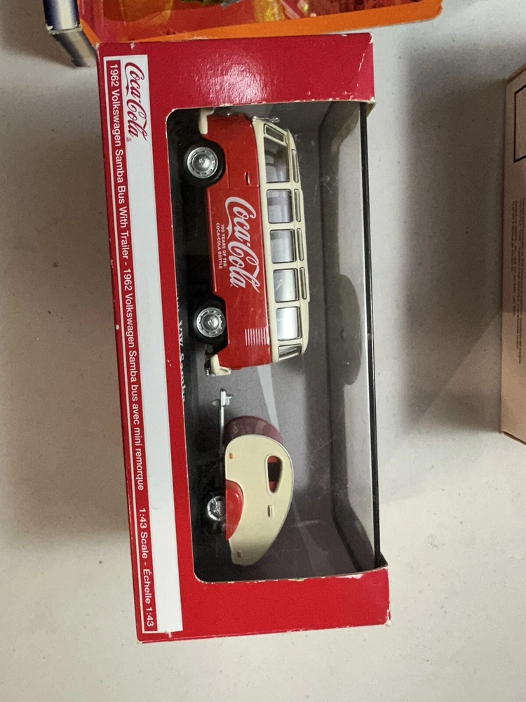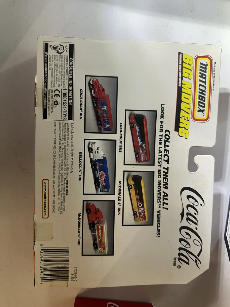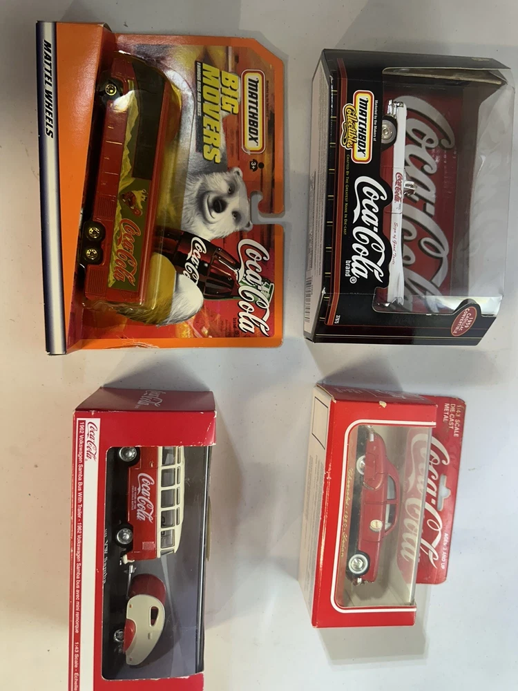 Brand new lot of 4 Match boxs big movers is damage box you can see in the picture This lot of 4 collectible cars from Motor City Classics is a must-have for any Coca-Cola or diecast car enthusiast. The set includes a VW Samba bus, Matchbox cars, and is all in its original packaging. The cars are in great shape and have not been customized or autographed. The color of the cars is a vibrant red, with a 1:43 scale model of the VW Samba bus. This set is perfect for collectors or as a gift for someone who loves cars or Coca-Cola memorabilia. Don't miss out on adding this unique set to your collection.