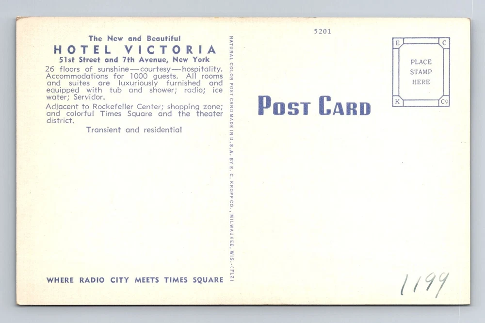 New York City, Hotel Victoria, Advertising, Antique Souvenir Vintage Postcard