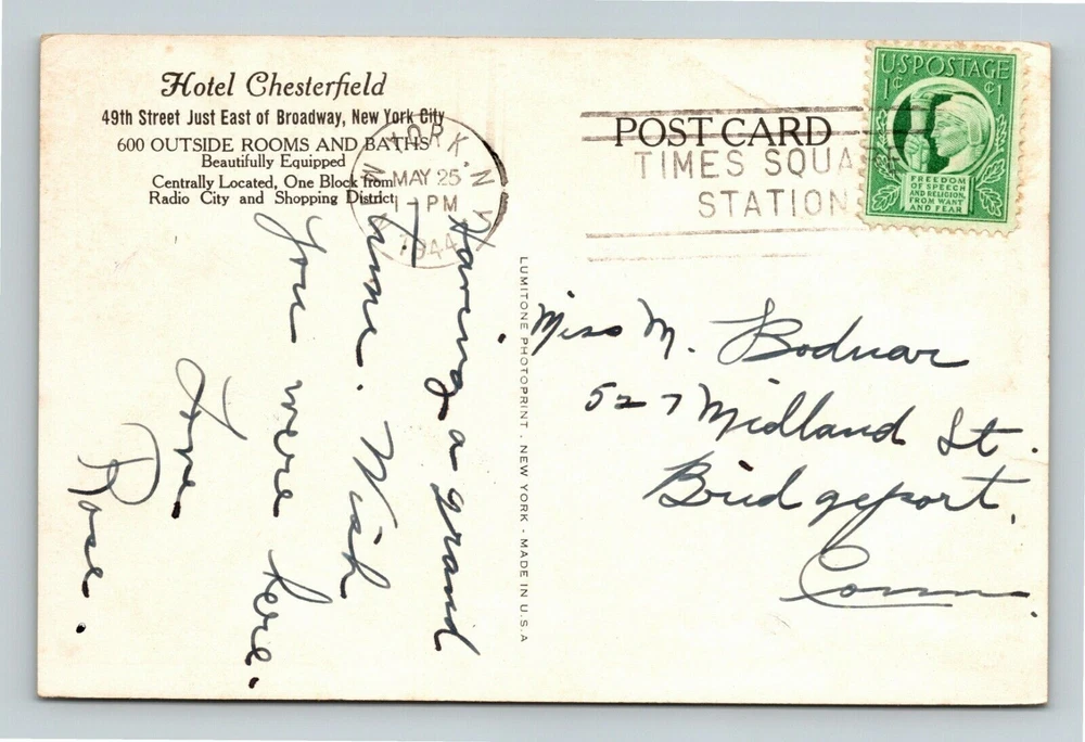 New York City NY,, Hotel Chesterfield, c1944 Vintage Souvenir Postcard