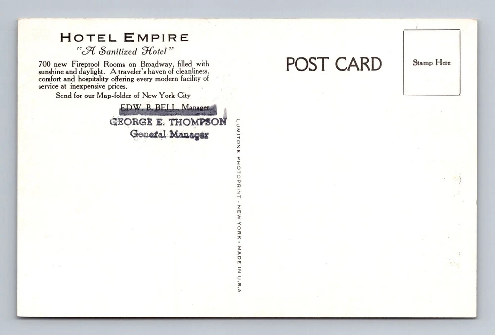 New York City NY, Hotel Empire, Broadway at 63rd, Advertising Vintage Postcard
