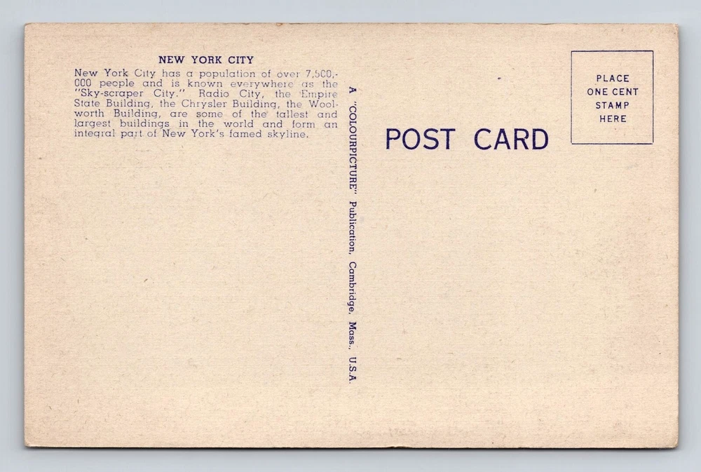 Type: Printed (Lithograph) Unit of Sale: Single Unit Country: USA Theme: Cities & Towns Region: New York Era: Vintage Subject: Cities & Towns Country/Region of Manufacture: Unknown Postage Condition: Unposted Original/Licensed Reprint: Original City: New York City