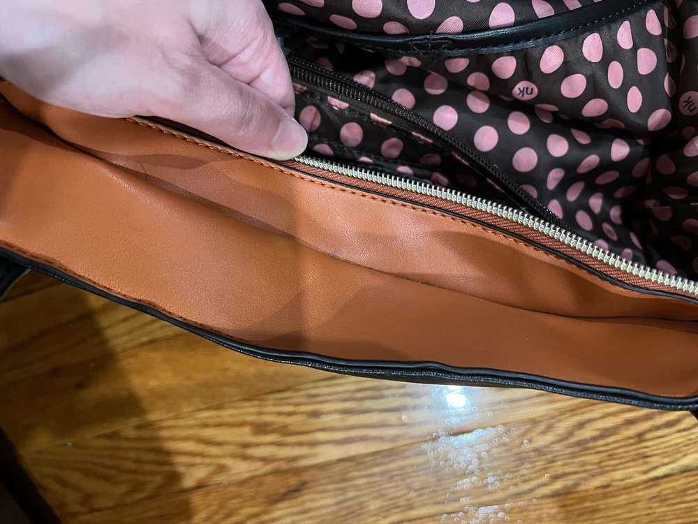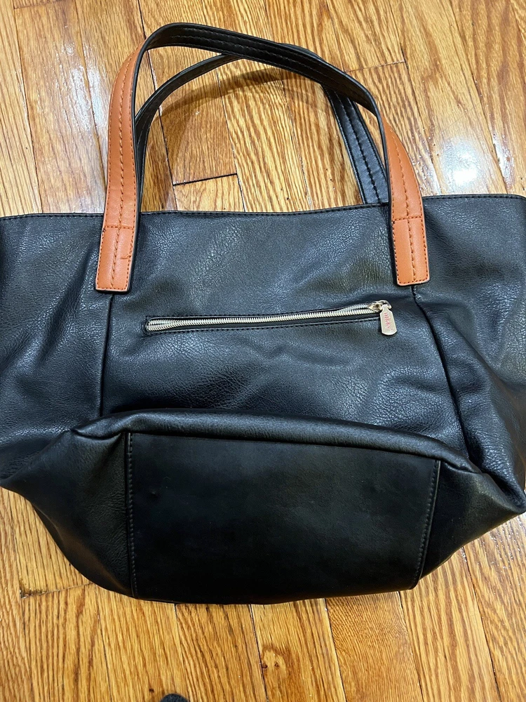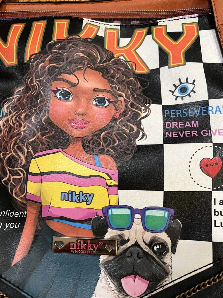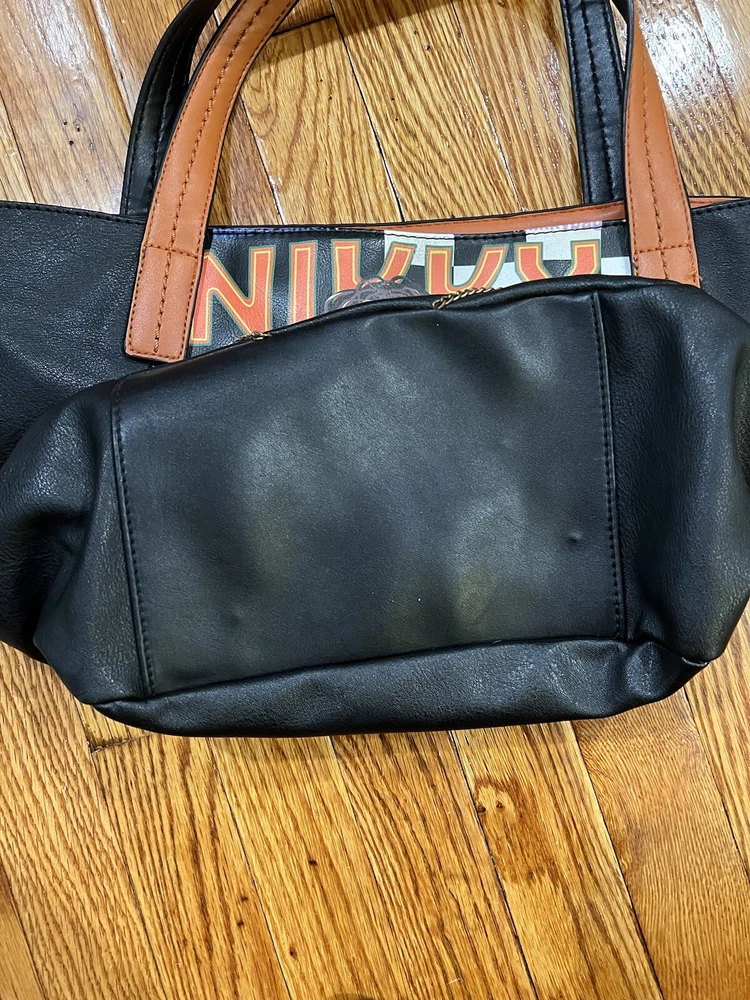 Nikky by Nicole lee shoulder tote bag. The bags exterior is in great condition, has no rips or tears. The design is as it’s supposed to be. The inside has has some wear on the lining but there is no rips. Has multiple pockets inside and one zipper pocket in the outside. The shoulder strap is missing.