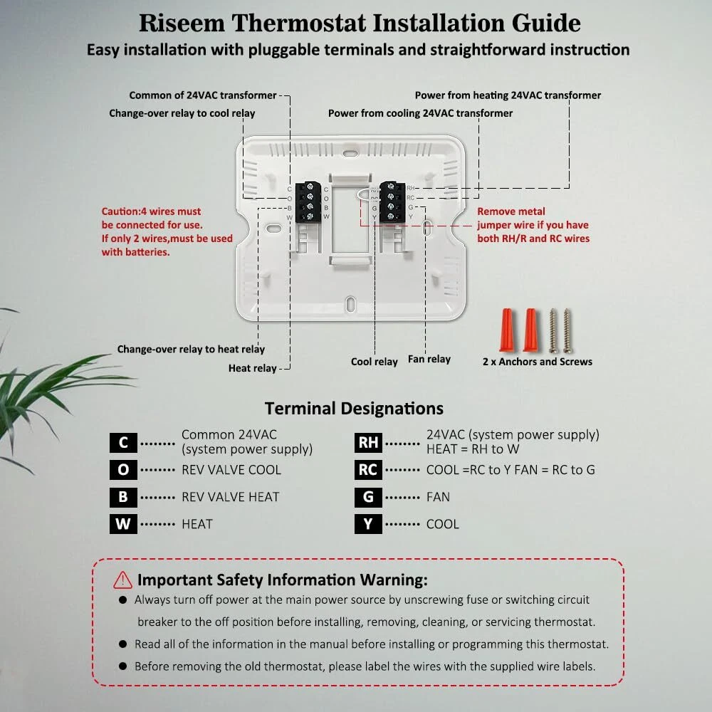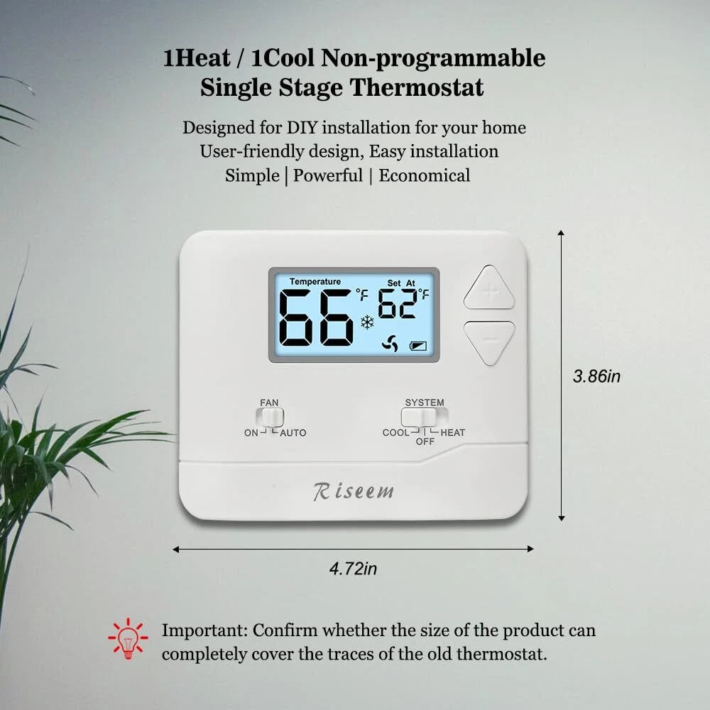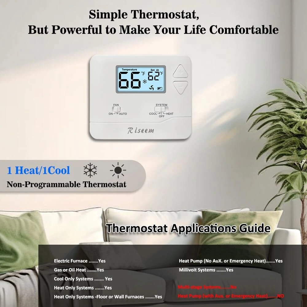 High Compatibility: Forced air (gas, oil or electric), Electric furnace, Hot water steam or gravity radiant heat, Heat only systems, Heat pump w/o auxiliary or emergency heat, Millivolt, Gas fireplaces (24V), Floor or wall furnaces, Cool only systems.(TIP: Before purchasing, check to see if this thermostat is compatible with your system.) Not Compatible: Heat pump with auxiliary or emergency heat, Dual fuel/hybrid heating, Electric baseboard heat (110-240 volts), Line voltage, Convectors, Radiant-ceiling heat, Mini split systems and 12V RV systems. Easy to Install and Use: Large terminal blocks with universal sub-base, can be installed within 30 minutes, clear, easy-to-read backlight LCD display and easy controls make for a user-friendly experience. Simple but Powerful Control: Easy-access front-load battery compartment, adjustable temperature differential (swing) for energy optimization and maximum system life, Support temperature display calibration, Convert °C/°F units, compressor delay protection (selectable on or off). Dual Power Supply: Can be powered by 24VAC power or 2 AAA batteries, No common wire (C-wire) required on most systems (only required on heat only and cool only systems).