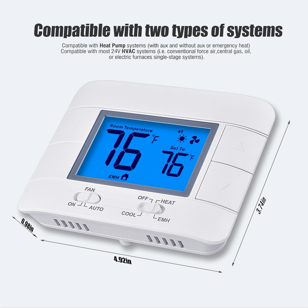 Store New Arrivals Add to Favorite View Feedback Contact Thermostat Non Programmable Heat Pump Thermostat for House 2H/1C, with Large LCD Display of Room Temperature and Humidity Description Item model number M721 Style Heat Pump Thermostat Power Source [User-Determined: 24VAC or Battery] Control Method Remote Temperature Control Type Manual Controller Type Push Button Control Type Button Control Product Dimensions 0.99"D x 4.92"W x 3.73"H Material Plastic Model Name Heat Pump Thermostat Specific Uses For Product Heat Pump Thermostat Included Components Temperature Sensor Country of Origin China Item Weight 5.6 ounces Special Feature Large Display Display Type LCD Mounting Type Wall Mount Color Blue Backlight Shape Rectangular Voltage 24 Volts (AC) Manufacturer Mroinge Brand Mroinge Backlight Yes Non-programmable heat pump thermostat for home up to 2 heat/ 1 cool, it is designed for easy installation and operation. (Kind reminder: Before purchasing, please check if this thermostat is compatible with your old thermostat) Large Numbers Display: The thermostat features a large display with clear and easy-to-read numbers, making it convenient for anyone to check the temperature and humidity levels at a glance. Does Not Work with 110-240V HVAC systems, Does Not Work with 120/240V electric baseboard heat / line voltage systems, and Does Not Work with RV thermostat. Compatible: heat pump systems and central gas, oil, or electric furnace systems, our thermostat can efficiently control the heating and cooling of your home, providing maximum comfort. Power Options: The heat pump thermostat can be powered either by a 24VAC power source or 2 AAA batteries (C-wire is not required), giving you flexibility in choosing the power supply that suits your needs. Temperature Calibration: Our thermostat allows for temperature calibration, ensuring accurate and precise temperature control, so you can enjoy the perfect indoor climate. Compressor Delay Protection: Equipped with compressor delay protection, our thermostat prevents frequent cycling of the compressor, extending its lifespan and saving energy. Separate Heating and Cooling Swing: The heating and cooling swing feature of our thermostat allows for better temperature control, ensuring optimal comfort in your home. with 2-year warranty. Product Description Mroinge M721 Non Programmable Heat Pump Thermostat Mroinge M721 non programmable heat pump thermostat is the perfect solution for homeowners looking for a reliable and easy-to-use thermostat for their heating and cooling systems. With its easy installation process, even Middle-Aged Elderly People can effortlessly set it up without any hassle. The thermostat features a large display with clear and easy-to-read numbers, making it convenient for anyone to check the temperature and humidity levels at a glance. Designed to be compatible with heat pump systems and central gas, oil, or electric furnaces systems, this thermostat offers versatility and flexibility for different heating options. You can rest assured knowing that it will seamlessly integrate with your existing system. The thermostat operates on 2 AAA batteries, ensuring long-lasting and reliable performance. With the heating and cooling swing feature, you have the flexibility to set the temperature range within which the thermostat will activate the heating or cooling system. This allows for optimal comfort and energy efficiency. Additionally, the thermostat offers temperature calibration, allowing you to fine-tune the temperature readings for precise control. One of the standout features of this thermostat is the built-in compressor delay protection. This feature helps to extend the lifespan of your heating and cooling system by preventing frequent cycling, reducing wear and tear on the compressor. In summary, the non programmable heat pump thermostat is a reliable and user-friendly option for homeowners seeking a hassle-free solution for their heating and cooling needs. Its easy installation, large display, compatibility with various systems, and additional features such as temperature calibration and compressor delay protection make it a top choice for anyone looking for a non-programmable heat pump thermostat. ABOUT US We offer the best prices around on high quality products. Our E-store includes media such as books, movies, music and games while offering electronics, toys, sporting apparel, clothing, tools, general home, garden items and more. SHIPPING We are always working hard to ensure your package arrives as soon as possible. Please understand that some factors like weather, high postal traffic, and the performance of shipping companies are outside of our control. We offer free shipping to the lower 48 states and ship within 2 business days of payment, usually sooner. We do not accept P.O. Boxes. Please provide a physical address. RETURNS We offer a 30-Day Return Policy on items which you are not completely satisfied with. You have the option for a full-refund or an exchange of the item. No returns are available on items shipped outside of the USA. PAYMENT We accept PayPal. CONTACT US This page content is yet to come Please ad us to your favorite seller and visit again later Thank You CUSTOMER SATISFACTION We try our very best to make sure every customer is completely satisfied. If there's a problem, message us! We're happy to help.