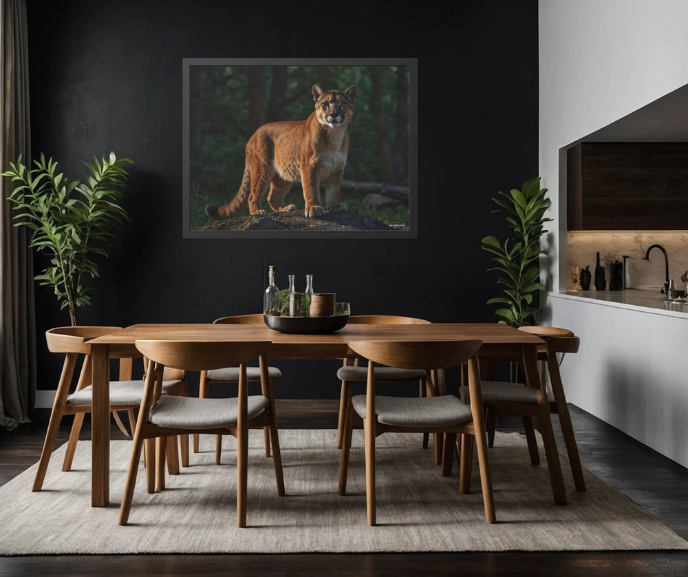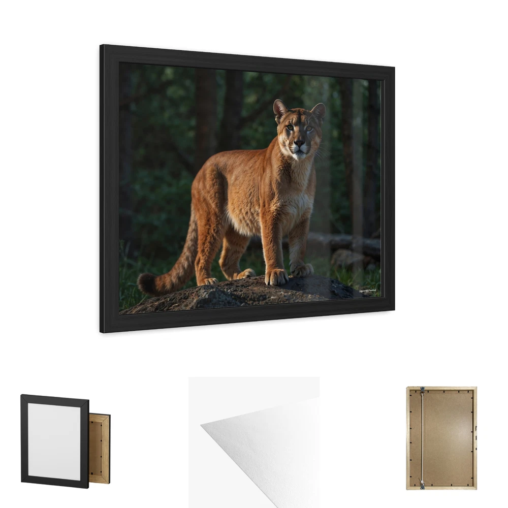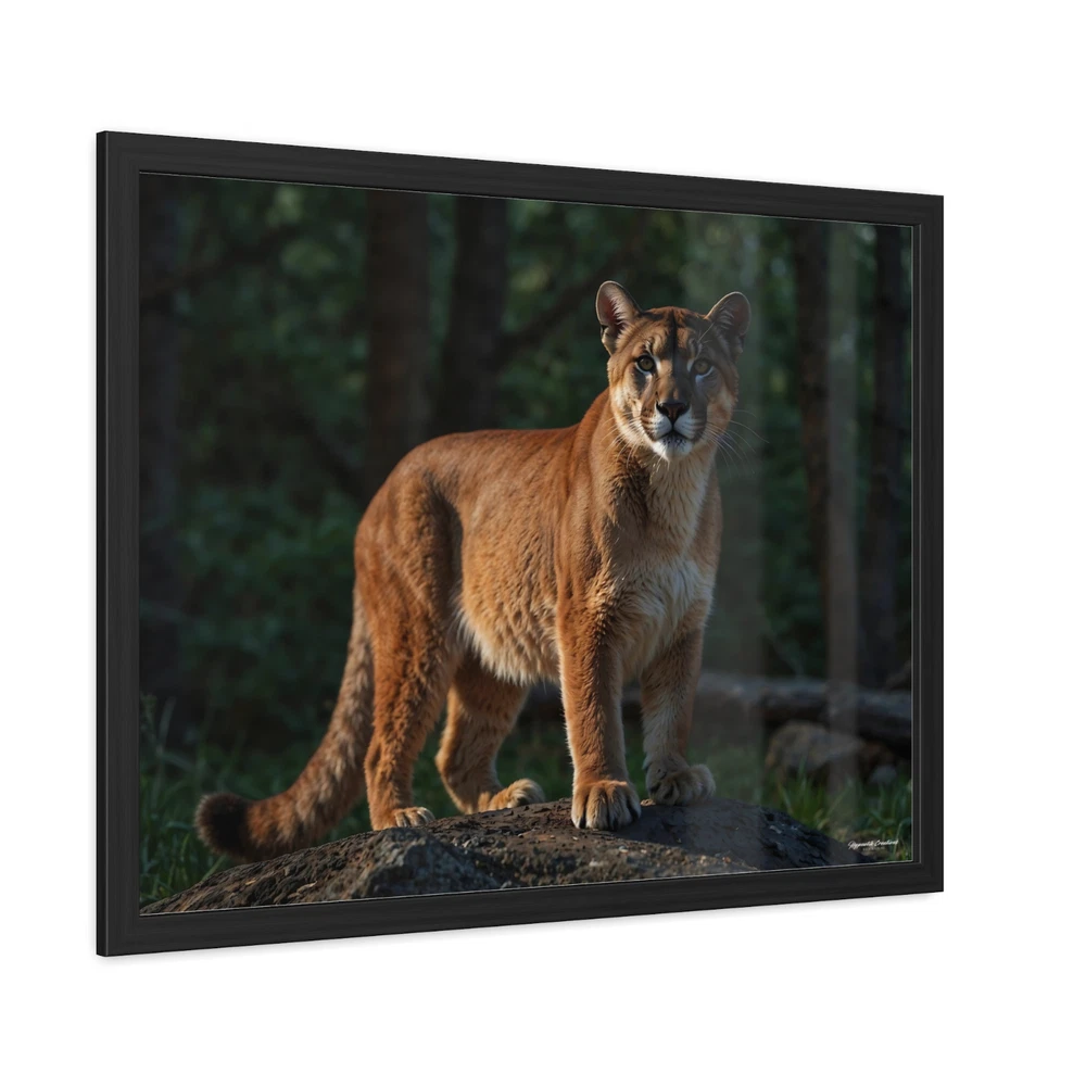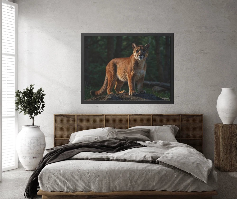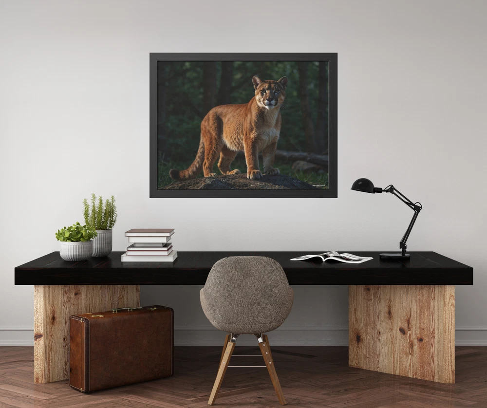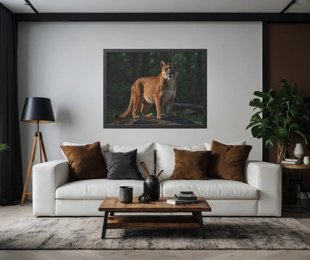 North American Mountain Lion in the Wild – Framed Wildlife Photography Product Description: Experience the awe-inspiring presence of the North American Mountain Lion with this breathtaking wildlife photograph by Hypnotik Creations. Set in its natural forest habitat, this powerful yet graceful creature embodies the essence of nature's guardian. Perfect for wildlife enthusiasts and nature lovers, this stunning piece brings the untamed beauty of the wild into your home or office. Expertly printed in HDR on premium 200gsm semi-gloss or matte coated paper, this artwork is crafted with the highest attention to detail. Using state-of-the-art Mimaki UV inks, the print delivers vibrant, crisp colors and lifelike clarity. Enclosed in a hand-crafted black wooden frame made from durable pine wood, the frame features a semi-wide, smooth finish, complemented by a clear Perspex insert cover that is both scratch and shatterproof. Eco-conscious and sustainably crafted in the USA with globally sourced and recycled materials, this artwork reflects both artistic excellence and environmental responsibility. The framed version arrives ready to hang, with an enclosed back and a hanging kit included for effortless installation. For those seeking a minimalist touch, the photograph is also available unframed, allowing flexibility in presentation. Care is simple: If dust gathers, gently wipe the surface with a clean, dry cloth. Whether framed or unframed, this wildlife masterpiece adds a captivating focal point to any interior space. Key Features: Striking Wildlife Photography: Features the mighty North American Mountain Lion in a lush forest setting. Premium Printing: Printed in HDR on 200gsm semi-gloss or matte coated paper for vivid colors and crisp details. Hand-Crafted Black Wooden Frame: Made from durable pine wood with a semi-wide, smooth finish. Protective Cover: Clear Perspex insert is scratch and shatterproof for long-lasting protection. Eco-Friendly Materials: Made in the USA using globally sourced and recycled parts. Ready to Hang: Includes an enclosed back and a hanging kit for easy installation. Unframed Option Available: Offers versatility for different display preferences. Low Maintenance: Easily wipe clean with a dry cloth to maintain its pristine appearance. Size Options: 24x18 & 32x24 This elegant wildlife print combines the beauty of the natural world with exceptional craftsmanship, making it an unforgettable addition to any décor. * Shipping to Alaska, Hawaii, and unincorporated territories of the United States can take additional 7 ? 12 business days, weather permitting.