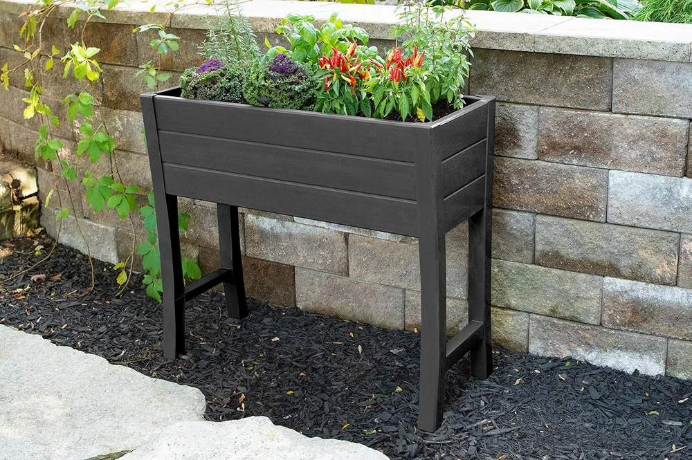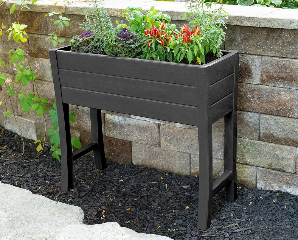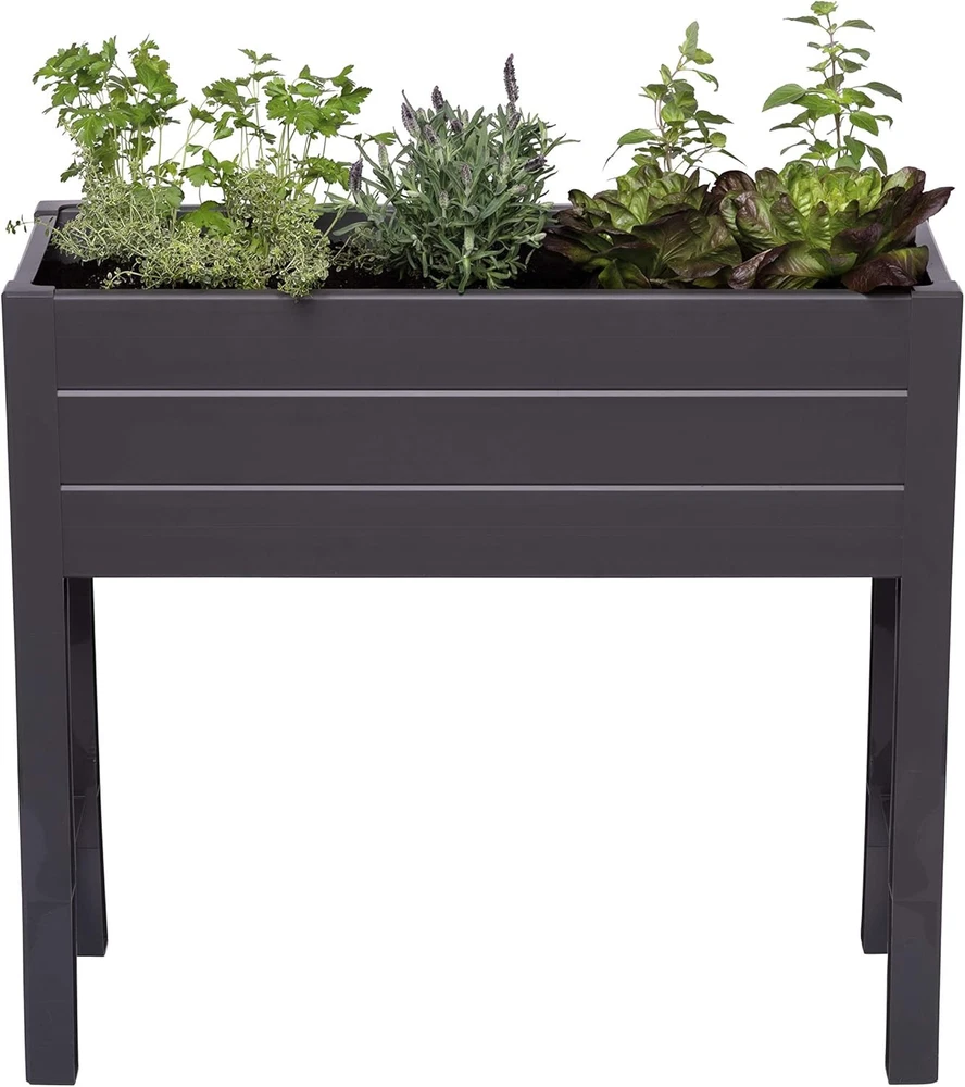 NuVue Products 26021 Outdoor Elevated 35.5” L x 15” W x 32” H, Dark Gray Product Details Color: Dark Gray Special Feature: Drainage Hole Style: Art Deco Planter Form: Box Shape: Rectangular Indoor/Outdoor Usage: Outdoor Mounting Type: Floor Standing Plant or Animal Product Type: herbs Product Dimensions: 15"D x 36"W x 32"H Brand: NuVue Capacity: 36 Liters Number of Pieces: 15 Pattern: Solid Included Components: Elevated Garden Box Item Weight: 16 ounces UPC: 039996260211 Size: 35.5” L x 15” W x 32” H Item Weight: 1 pounds Manufacturer: Nuvue Products Item model number: 26021 Is Discontinued By Manufacturer: No OUTDOOR RAISED GARDEN BOX: Makes it easy to add a beautiful, luscious garden to any patio, balcony, backyard, front porch, sunroom, or other outdoor space of your home SAFE FOR GROWING EDIBLE PLANTS: BPA-free garden box is certified safe for growing edible plants, making it ideal for growing herbs, salad greens, berries, vegetables, succulents, flowers, and much more DURABLE AND STYLISH: Constructed from heavy-duty, UV-resistant dark gray polymer with built-in draining and a woodgrain panel texture, this maintenance-free garden planter is as durable as it is attractive and will not rust, rot, or mold INCLUDED FABRIC LINER: In addition to the hard bottom panel, a custom fit fabric liner is included, allowing excess moisture to pass through while retaining the soil inside EASY TO MAINTAIN AND ASSEMBLE: Measures 35.5” L x 15” W x 32” H with a 10.75” depth that accommodates deeper rooting materials in a compact unit, and NuVue's Twist-Lock system allows for an easy, tool-free assembly Growing plants and other greenery is a breeze with the NuVue Products 26021 Elevated Garden Box. This elevated planter box makes it easy to add a beautiful, luscious garden to any patio, balcony, backyard, front porch, sunroom, or other outdoor space of your home. The BPA-free garden bed is certified safe for growing edible plants, making it ideal for growing herbs, salad greens, berries, vegetables, succulents, flowers, and much more. Constructed from heavy-duty, UV-resistant dark gray polymer with built-in draining and a woodgrain panel texture, this maintenance-free garden planter is as durable as it is attractive and will not rust, rot, or mold. In addition to the hard bottom panel, a custom fit fabric liner is included, allowing excess moisture to pass through while retaining the soil inside. Set-up is a breeze with NuVue’s unique Twist-Lock system which allows for a quick and easy assembly with no tools required. Measuring 35.5” L x 15” W x 32” H, this outdoor plant box offers ample space to grow plants, vegetables, herbs, flowers, or fruits, and the 10.75” depth accommodates deeper rooting materials in a compact unit.