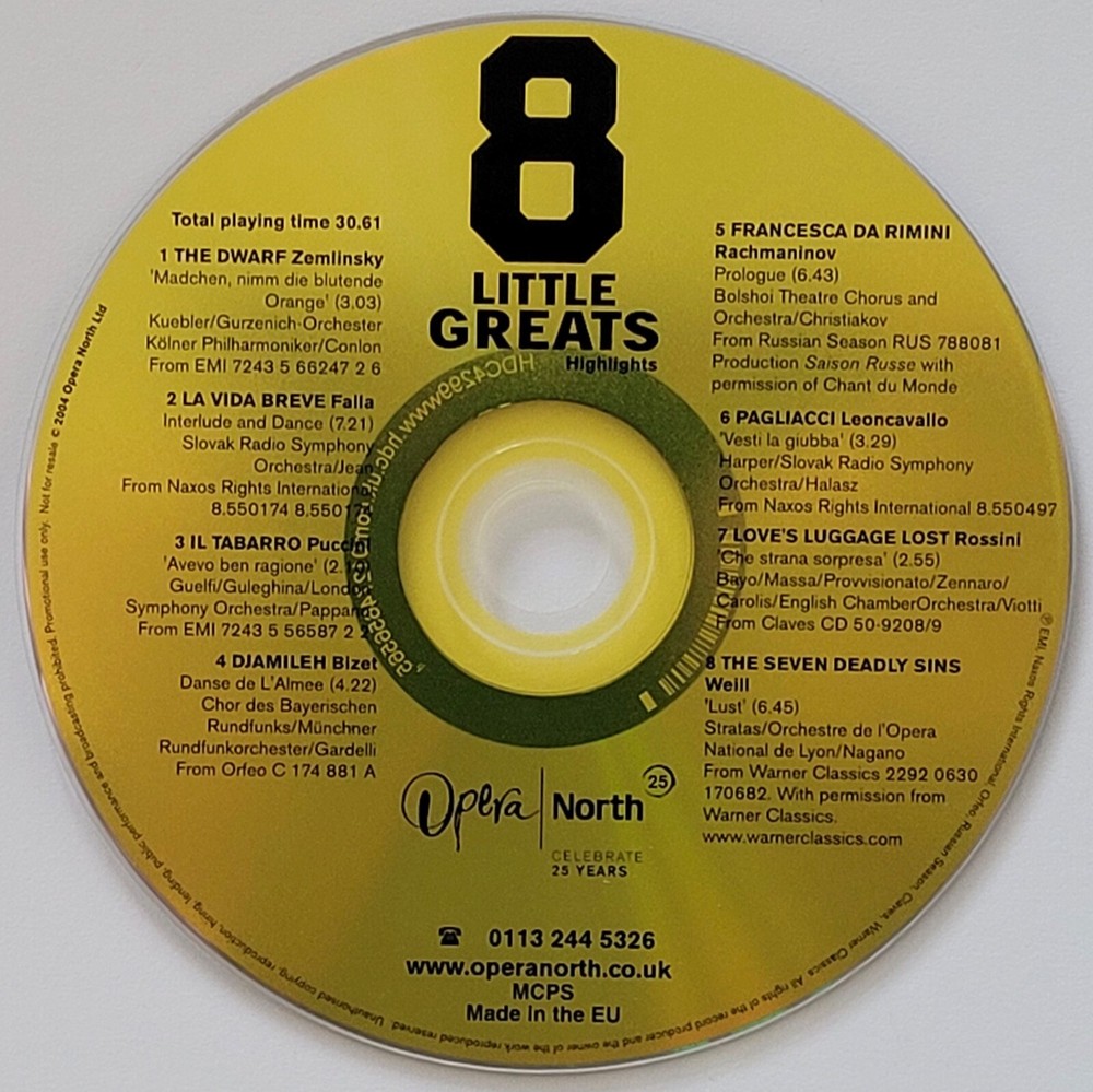 8 Little Greats Highlights. A festival of short but grown up opera. See photo for tracklisting. CD in card sleeve. Good condition. Postage will be combined for multiple purchases.