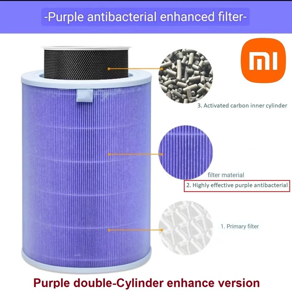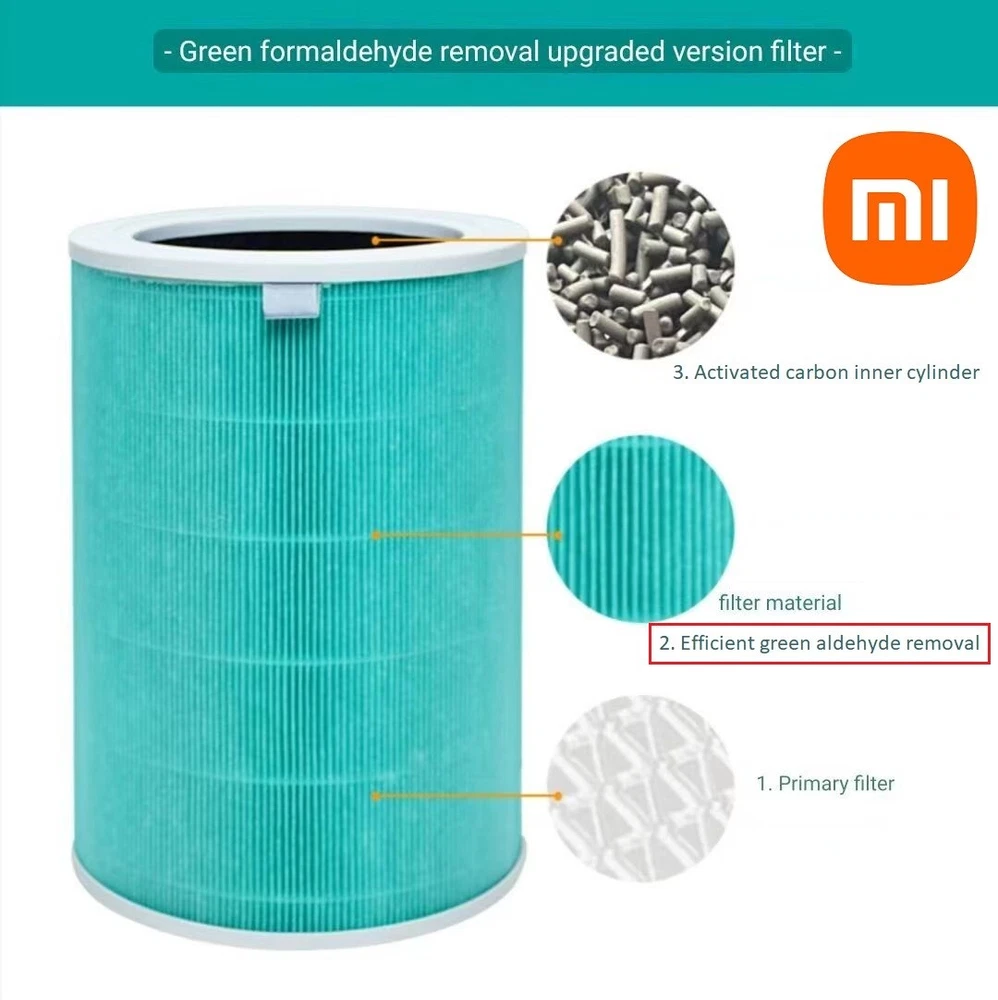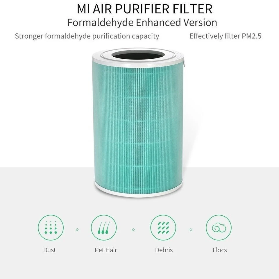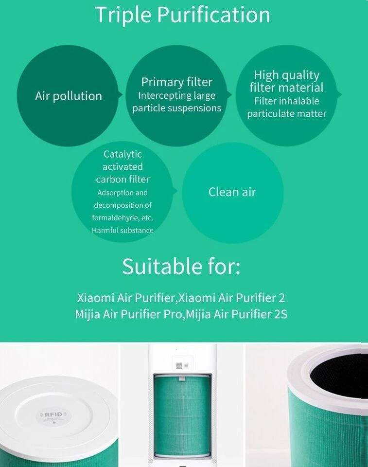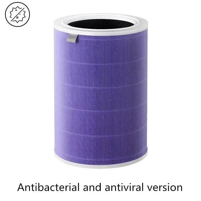 G enuine Xiaomi Smart Mi Air Purifier Original Replacement Filters (Worldwide Free Shipping!) This Xiaomi Mi filter is Suitable for Xiaomi OLED Display Smart Air Purifier 2S / Xiaomi Mi Air Purifier 1 / Xiaomi Mi Air Purifier 2 / 2H / 2C / 2S/ Xiaomi Mi Air Purifier 3 / 3H and Xiaomi Mi Air Purifier Pro model (NOT SUITABLE FOR "PRO H" model). The Mi filter comes with the RFID chip at the bottom of the filter, which is essential to communicate with the APP. (The other cheap non-genuine replacement filters does not include this essential chip). Our optional comes 4 available original filters for your Xiaomi air purifier: Blue: there are 1 ), standard filter consisting of 2 layers, or 2 ), Upgrade version has 3 layers (primary filter for large particles, HEPA filter for fine particles and pollens, and activated carbon to eliminate bacteria, viruses, etc). Green : is a more efficient filter that can also remove formaldehyde, benzene, and ammonia. The H11 grade HEPA filter retains 99% of the PM0.3 class and 99.99% of the PM2.5 class. The green filter is also more effective at eliminating odors like cigarette smoke. Purple : It has the same efficiency as the Green filter + Has an anti-bacterial, anti-viral coating that eliminates bacteria and airborne pathogens. It is the most suitable for bacteria season, unventilated room, and stream of a closed environment. 360° filtration, 3 layers high-efficient purification It contains 3 layers of high-efficient filtration and purification (Primary filter, EPA filter, and high-quality activated carbon) The cylindrical shape provides 360° filtering of large floating particles and harmful substances. Primary filter It has high flexural strength and is resistant to folding, grease, fats, acids, alkalis and most solvents. The cylindrical shape provides 360° filtering of dust, hair and other larger floating particles. EPA filter HEPA (High-efficiency Particulate Arrestance) is frequently used in hospitals and labs to filter out micron-sized particles. Mi air purifier filter uses an ultra-dense Toray PP to trap PM2.5, PM0.3, pollen and other inhalable particles. The HEPA filter of the Xiaomi Air Purifier is capable of removing 99.9% of the fine particles (PM2.5) but also the bacteria, heavy metals, viruses, formaldehyde present in the atmosphere. Quality coconut activated carbon Activated carbon absorbs harmful gasses that HEPA is unable to filter. Mi Air Purifier's coconut activated carbon is among the most effective of its kind. Absorbs all kinds of odors and harmful substances Mi Air Purifier's coconut activated carbon filter absorbs hundreds of harmful substances in these situations, keeping your home clean and your family healthy. Real-time usage monitoring All filters lose effectiveness over time and must be replaced promptly. Filters not replaced on time may not be able to block harmful substances or may cause secondary contamination. Contrary to what others may advertise, cleaning old filters with water or a vacuum cleaner does not guarantee that the filter will regain its effectiveness. It is recommended to replace the filter every 6 months or less, depending on your usage. Use the Mi Home app to monitor filter lifespan and receive notification reminders whenever your filter needs replacement. To be certain of the effectiveness of your Air Purifier, it is best to buy original filters.